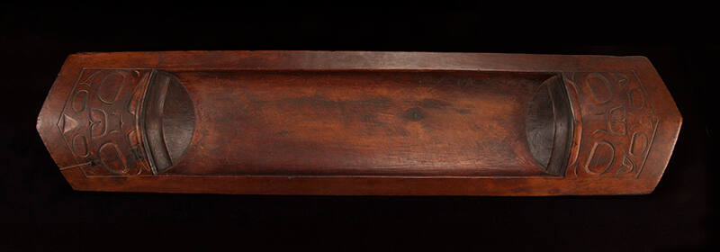 Label TextElongated feast trays are prominently displayed at feasts. The identity of the abstracted face on this tray is not known, but it has powerful symbolic references to wealth and abundance. The edges of the tray mimic the outline of a copper, an object associated with a chiefly status and affluence.ProvenanceAlton L. Dickerman, Colorado Springs, Colorado, ca. 1883; Miss Foster B. Dickerman, Colorado Springs, Colorado; Mrs. Alice Bemis Taylor, Colorado Springs, Colorado; Taylor Museum (4981), Colorado Springs, Colorado