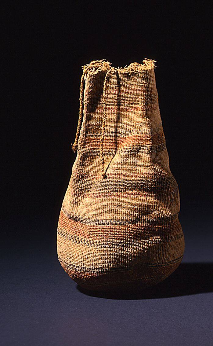 Label TextThe exceptional antiquity of this small delicate bag has been revealed by carbon dating. The bag is also remarkable for the fineness of its weave and for the survival of the drawstring around the opening. The weaver decorated the bag with alternating geometric bands of red and black, providing a contrast with the natural honey color of the hemp. Anestral Puebloans made a number of different types of bags and pouches.ProvenancePrivate collection, western New Mexico; Jerold Collings, Phoenix, Arizona; Toby Herbst, Galisteo, New Mexico