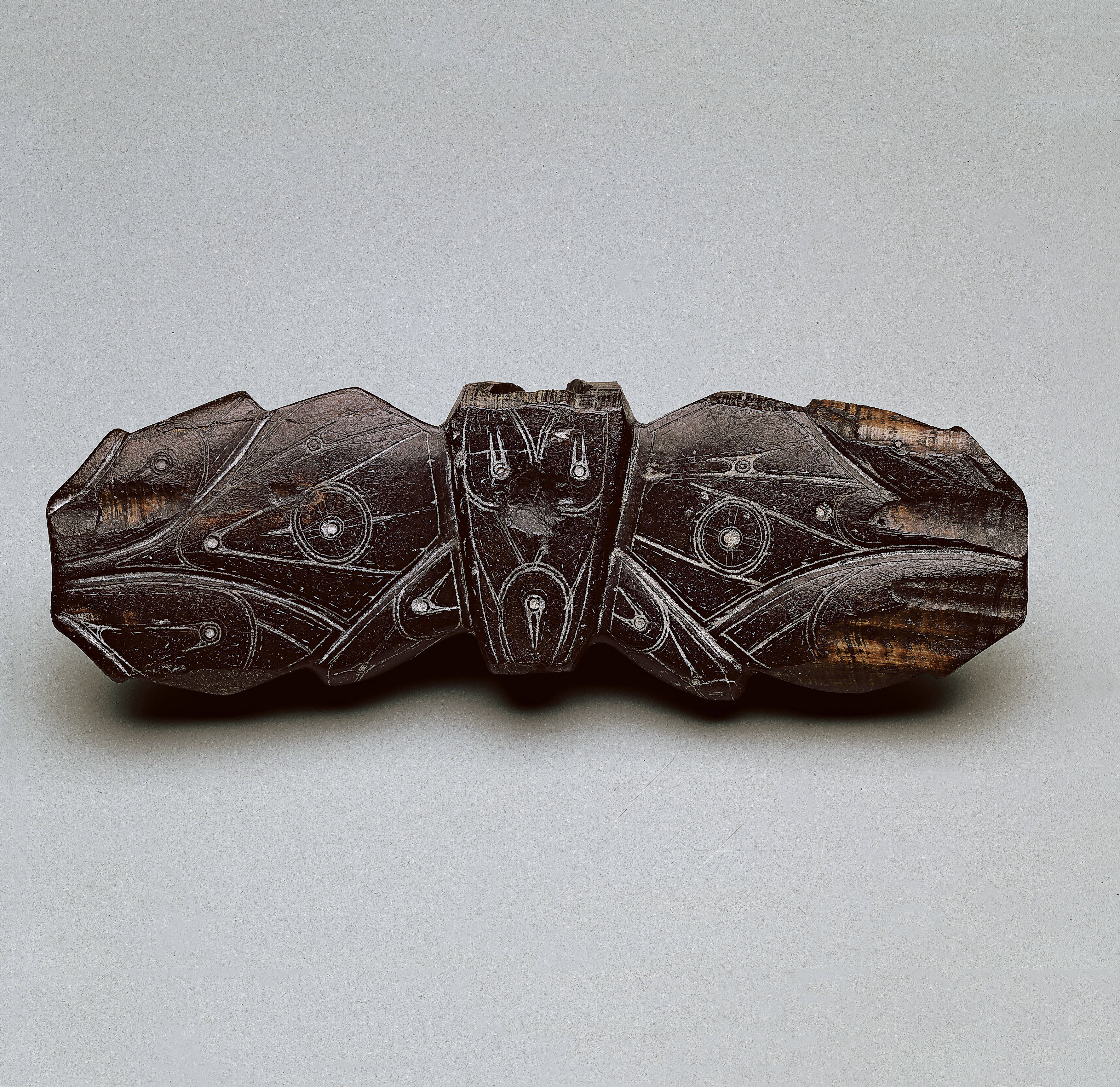 Label TextIvory objects such as this one are thought to have been used as counterweights on harpoons. Its shape, with two wing-like forms coming from the central segment, is suggestive of a bird gliding through the air. Its use to facilitate the harpoon’s flight adds to this interpretation. Hunters incised delicate geometric and abstract patterns on counterweights, likely as an aesthetic and symbolic expression.ProvenancePaul Steinhacker, Seattle, Washington (field collected at Southeast Cape site, St. Lawrence Island, Alaska)