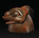 Tlingit war helmets featured carved figures of spirits, ancestors or clan crests that spiritually protected and empowered the wearer for battle. This helmet may represent a mouse, marmot, or other rodent, small creatures that sometimes figure in Tlingit myths. The helmet is constructed with the wood grain running from ear to ear in a traditional fashion to make it stronger and less susceptible to splitting from the force of a downward blow. Such helmets were part of a Tlingit warrior’s armor, effective in intertribal warfare until the advent of firearms.Exhibition History"Art Des Indiens D'Amerique Du Nord Dans La Collection D'Eugene Thaw," Mona Bismarck Foundation, Paris, France, Somogy Editions D'Art, January 21, 2000 - March 18, 2000.