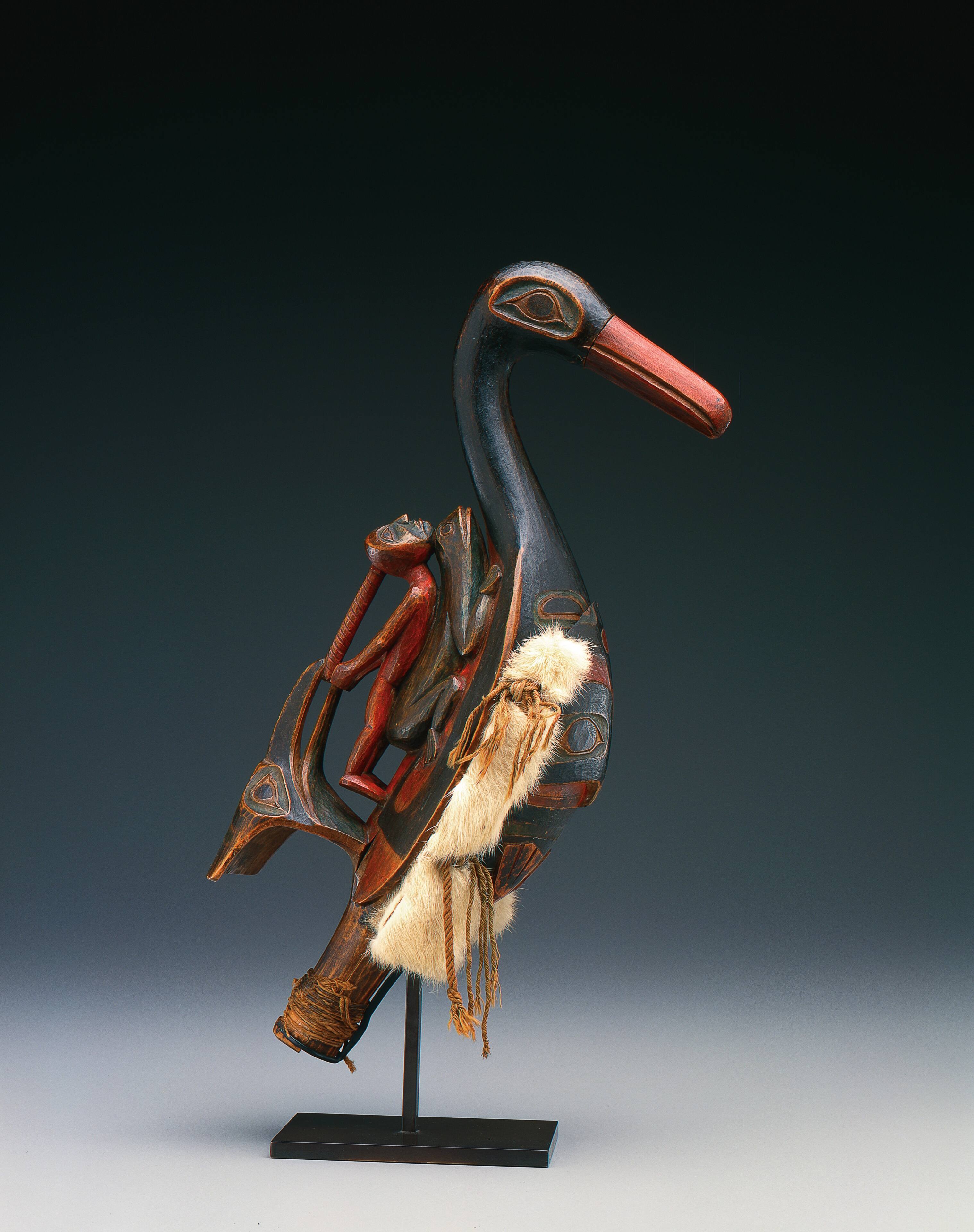 Label TextShaman’s used such rattles in company with singing and other rituals efforts to cure illness or spiritual possession. While the basic overall forms of such rattles are similar, their backs, displaying shamanic themes, display a diverse style and imagery. Here, the raven and frog combination seen on many Northwest Coast rattles has been altered, the frog supporting a bound witch that the raven is torturing by twisting his hair to extract a confession. Such dramatic shamanic imagery added to the intensity and power of the shaman’s rituals.Exhibition History"Art Des Indiens D'Amerique Du Nord Dans La Collection D'Eugene Thaw," Mona Bismarck Foundation, Paris, France, Somogy Editions D'Art, January 21, 2000 - March 18, 2000.