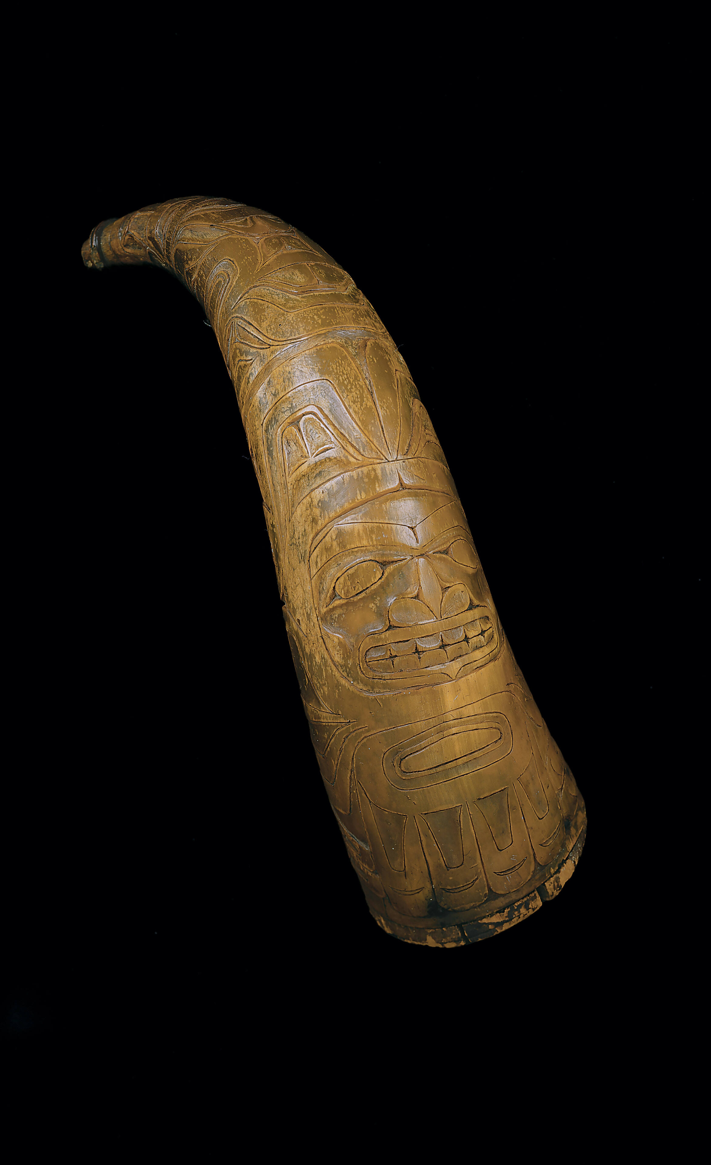 Label TextThe Tlingit artist who made this powderhorn oriented the carving upright along the length of the horn, unlike the horizontal orientation seen on American powderhorns. The depth of carving is also much greater than the work on American powderhorns. This powderhorn is one of three known to be carved by a Northwest Coast artist.ProvenanceAlan Steele, New York City; Jonathan Holstein, Cazenovia, New York