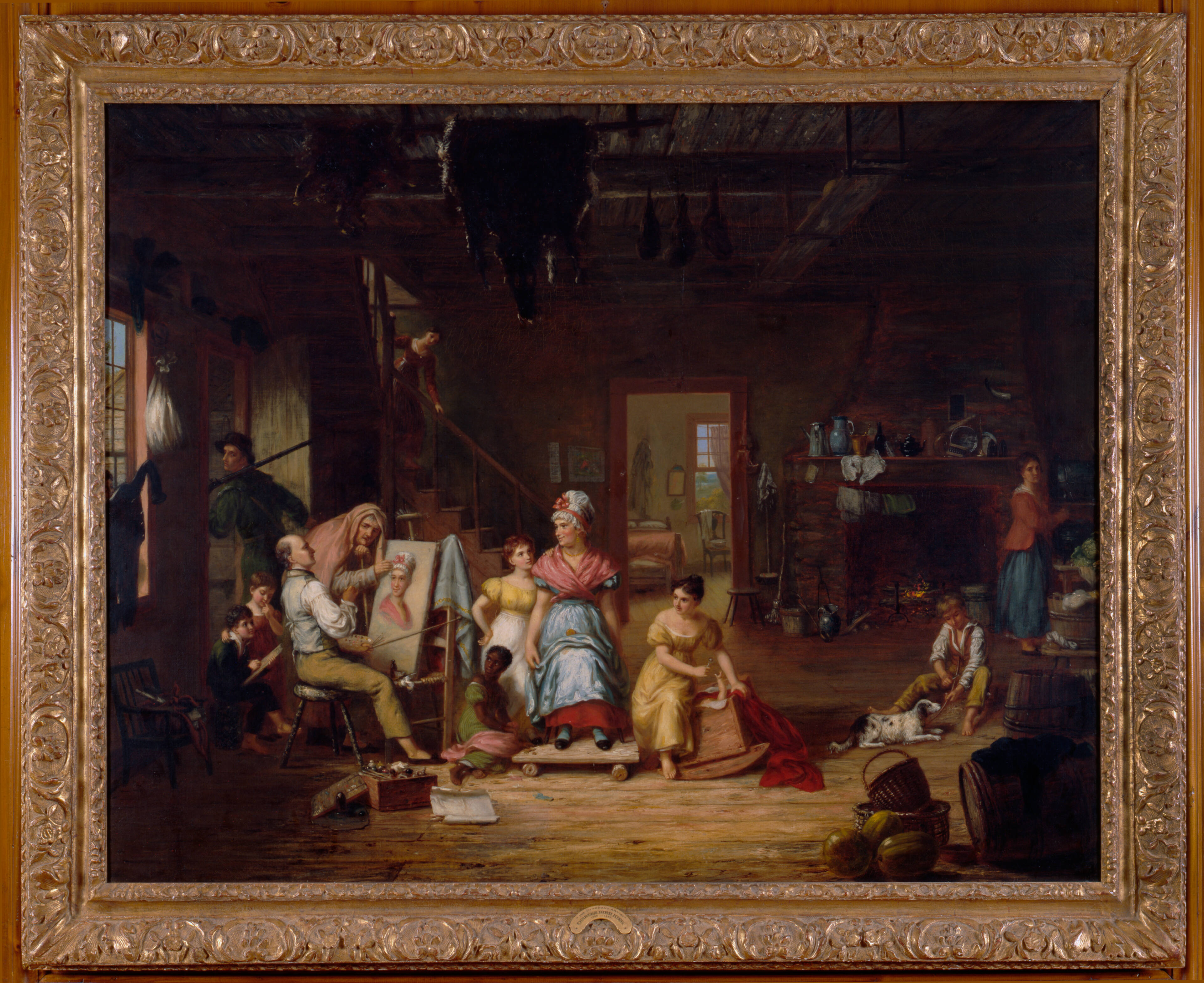 Label TextThis is a rare example of an academic, or trained, artist depicting a folk, or untrained, artist at work. This interior shows a typical 19th-century American activity in a non-American setting. A sitter is commissioning a portrait from one of the many artists traveling the country in search of work but is in a room more similar to the dark, cavernous interiors of 17th-century Dutch painting. In fact, King owned a print, The Painter’s Studio by Adriaen Van Ostade, that seems to be the source for this interior. Also Dutch in tradition is the highly lit focus on the figures, all centered in the fore plane while the sides and back recede in hazy darkness. Another Dutch feature is the detailed still life studies scattered about the interior. The romanticized, European interior is a continuation of the 18th-century’s historical concerns in genre painting, an attitude that was already changing in the contemporary work of William Sidney Mount and E. L. Henry.Genre paintings on this scale are rare, and rarer still in King’s body of work. Although primarily a portraitist, King painted still lifes, landscapes, and genre scenes on different occasions throughout his life.