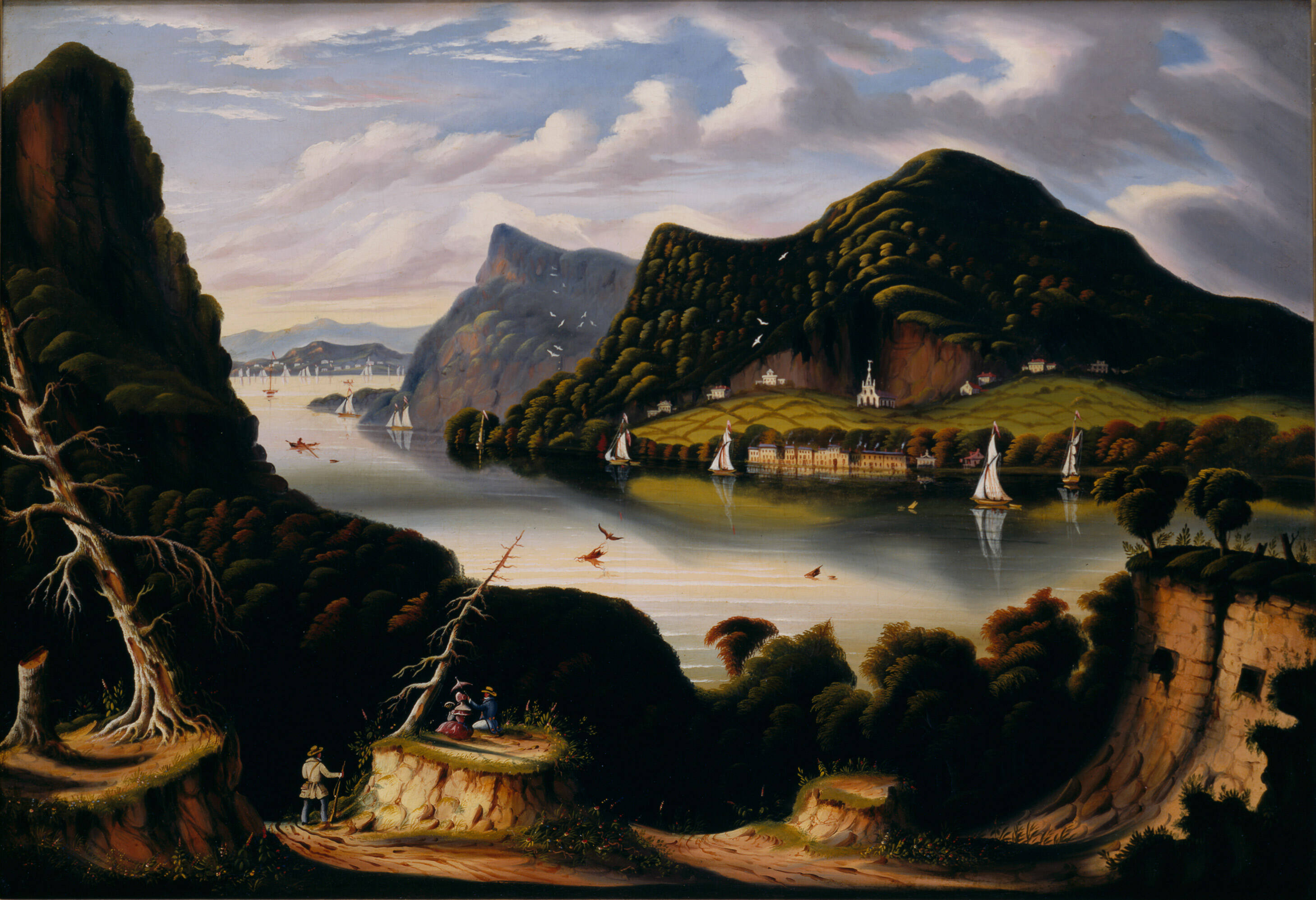 Label TextThomas Chambers emigrated from England to the United States in 1832. His work as a landscape and marine artist is characterized by simple outlines, bold colors, and strong forms. This popular view from Fort Putnam on the Hudson River shows the village of Cold Spring, home of the West Point Foundry, the most extensive iron works in the United States. Some of Chambers’ subjects were drawn directly from nature while others, such as View of Cold Spring, were inspired by prints. This painting, based on an engraving by John Henry Bartlett, follows the tradition of the Hudson River School of landscape painters, who depicted dramatic American landscapes. The ruins of Fort Putnam (a Revolutionary War-era landmark) are a subtle reference to American history and the European romantic interest in antiquity.Exhibition History“Folk Art from the Collection of the New York State Historical Association,” Museum of American Folk Art, NY, January 11, 2000 – February 18, 2000.