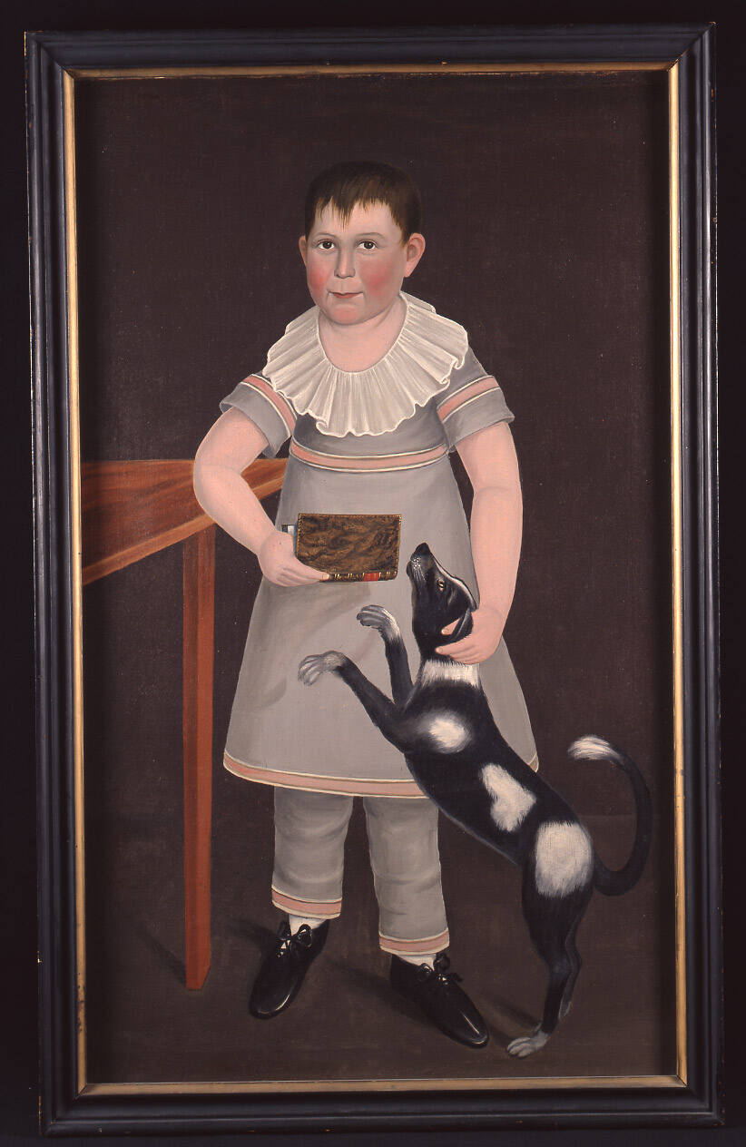 Label TextThis lively full-length portrait exhibits wonderful child-like impishness in the boy's facial expression and posture. The young subject stands next to a table in a dark interior scene, holds an open book in his right hand and grasps the ear of his playful dog with the left. His pudgy face, reddish flesh tones and slight smile evince a childishness rarely communicated in folk portraiture. The artist's inability to render anatomy realistically is evident in the boy's short neck, hunched shoulders and stiff legs, all of which happily contribute to the youthful exuberance of this figure. Adding to the portrait's visual appeal are the fashionable Titus or Brutus hair style and the gray pearlescent, high-waisted Empire suit, both features deriving from the popular French modes of the Napoleonic era in vogue during the early nineteenth century in America. Another attractive feature is the curious heart-shaped white spot on the dog's side. The artist clearly had some awareness of the properties of light, as the placement of shadows and shiny reflections on the boy's shoes indicate a single light source emanating from the right side of the picture.