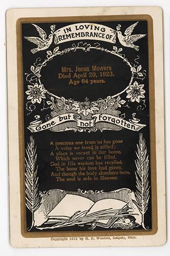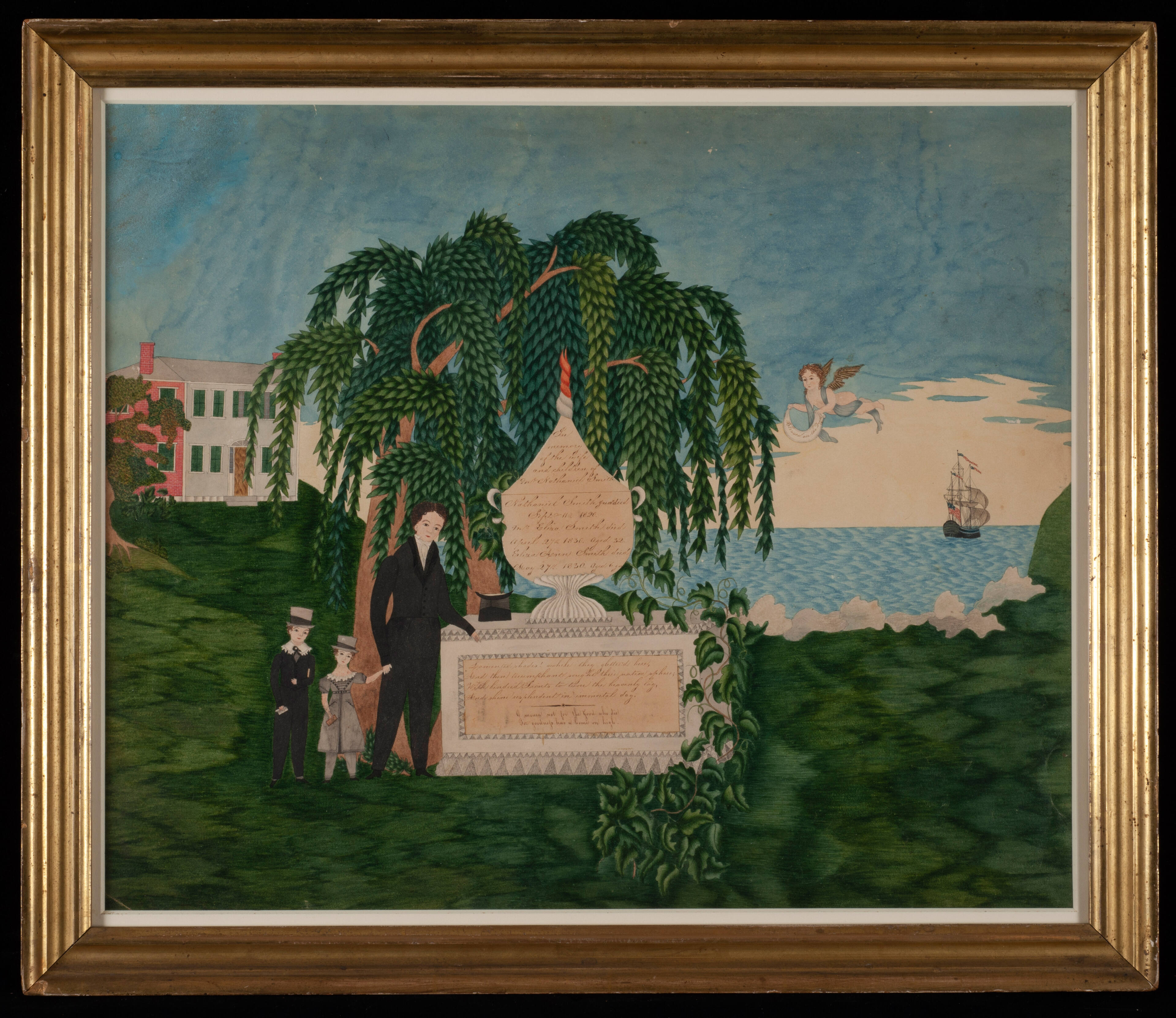 Label Text"Smith Memorial" derives from a late 18th century English tradition which blossomed into full flower in this country with the death of Washington in 1799. In the years following, all the lachrimosity of the Romantic movement found expression in the memorial pieces which young ladies were taught to do in school, and which some of them kept on doing long afterward. "Smith Memorial" is by a hand that has left us other similar watercolors, all characterized by a great crispness; there is one in the Garbisch Collection and at least two others in private collections. The colors are still very fresh and clean and the foliage of the trees is done in such a way that, it suggests the tradition of needlework so popular in the previous generation. Gold highlights and the handwritten pieces are pasted on the scene.BibliographyAgnes Halsey and Louis C. Jones, New-Found Folk Art of the Young Republic ([exh. cat.], Cooperstown, NY: NYSHA, 1960), p. 16.