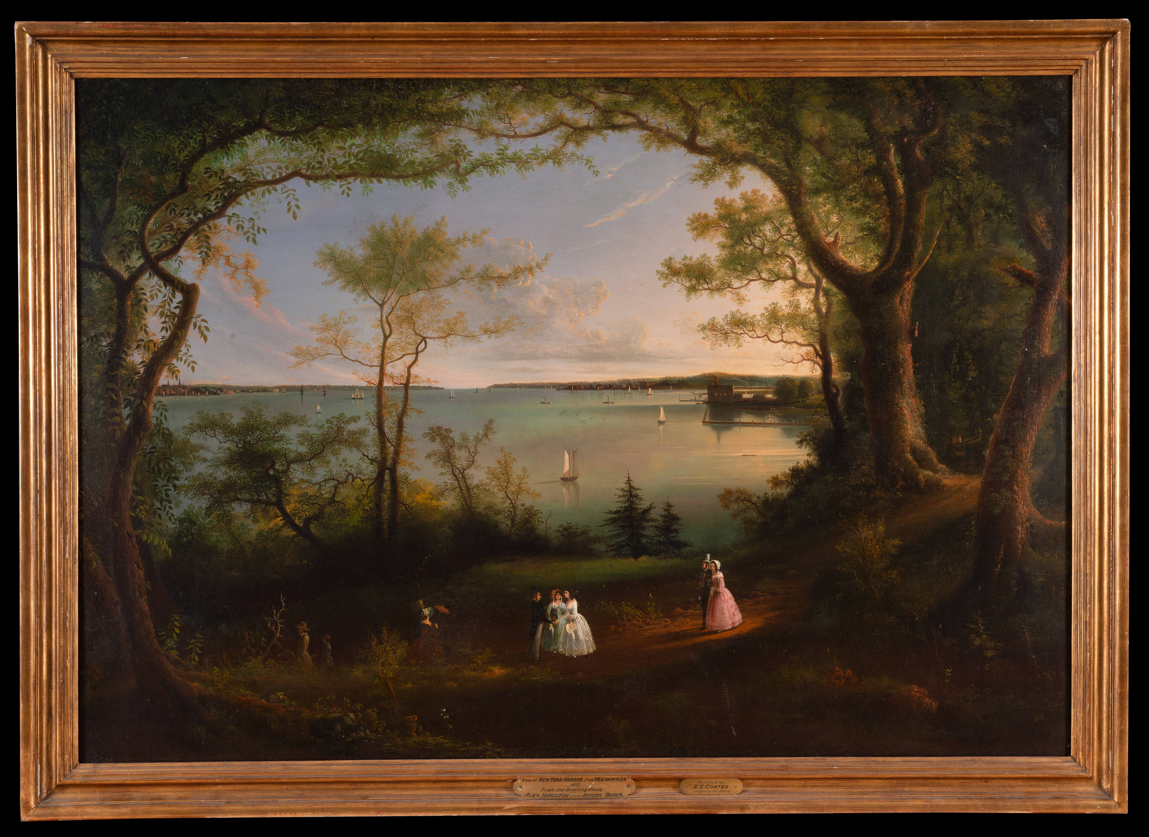 Label TextThis is an unusually large landscape painting, perhaps the largest in Coates' work. It was originally painted as a view of the Hamilton-Burr dueling ground in Weehawken, New Jersey. Just across the Hudson River from Manhattan, the area was a popular and fashionable spot for excursions from the city in the 1830s. The painting is dated twice - 1837 and 1847. Because of pentimenti, particularly a large tree that originally blocked the view, it seems as if Coates' first intention was to depict the site of the duel. The tree was later painted out - presumably in 1847 - and the vista opened up to depict a view of the entrance to New York harbor. More, if not all, the figures were added at this time.