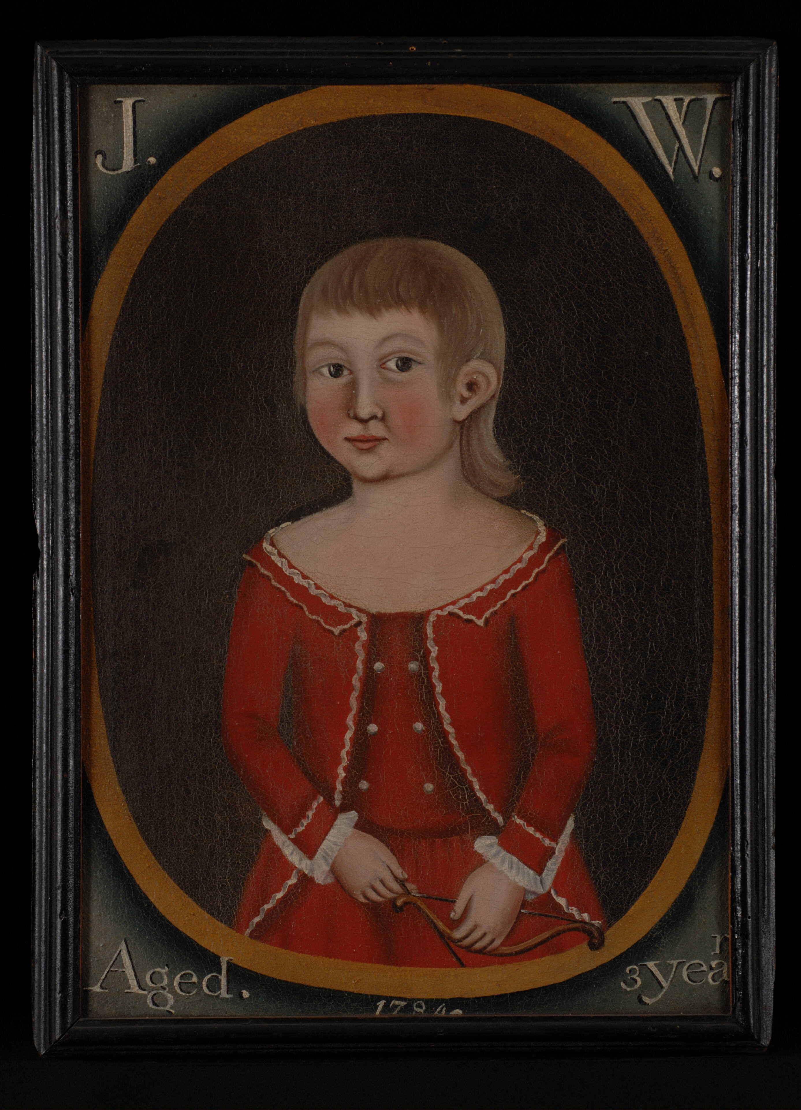 Label TextThese paintings are two of four known portraits by this unidentified artist. Stylistically related, all of the portraits are composed within an oval with each sitter holding a personalized object. The style of the inscriptions identifying the sitters' initials, age, and the date of the paintings have led to speculation that the artist was a sign painter.