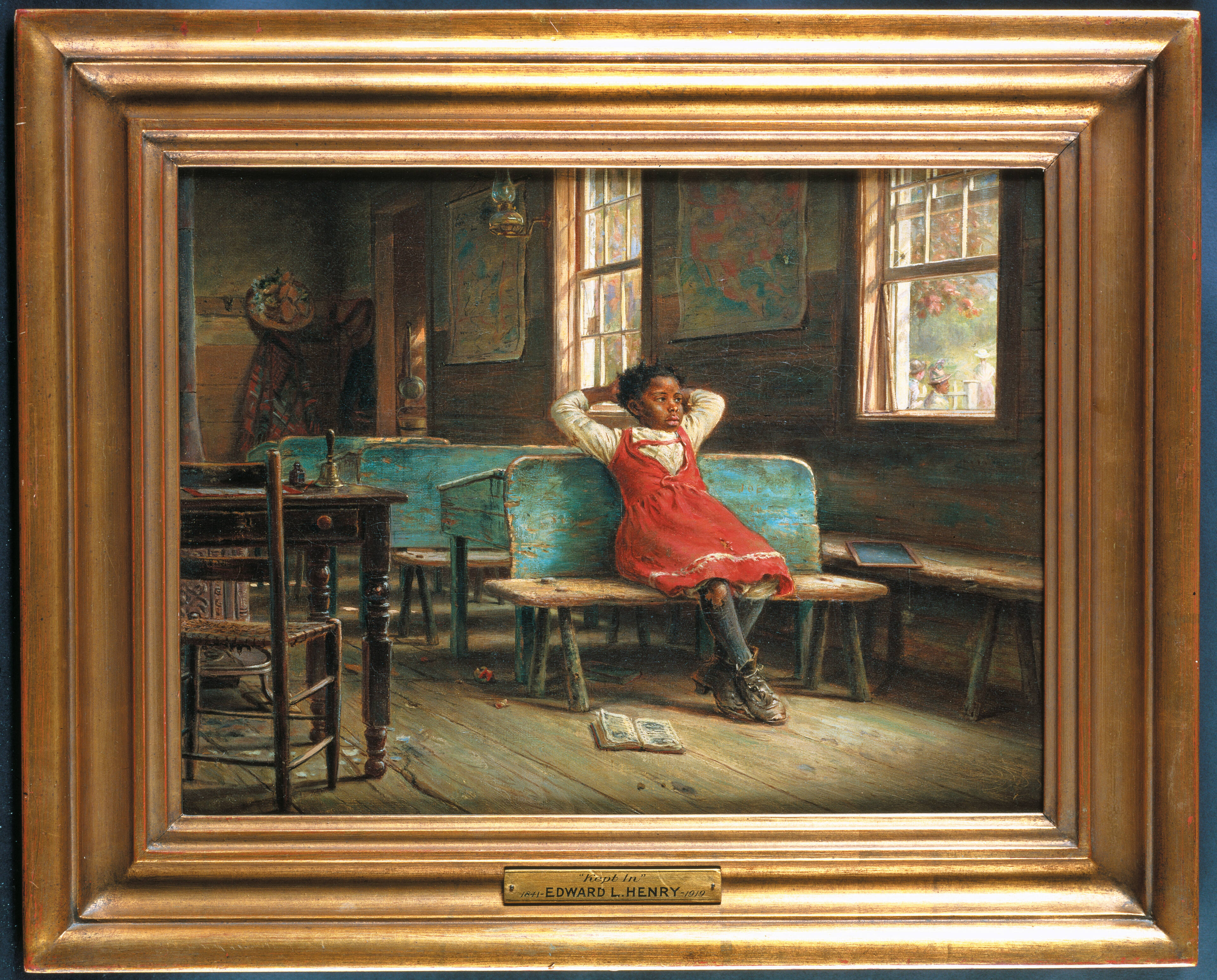 The frequency with which the little girl in the red dress appears in Henry’s paintings, sketches, and watercolors suggests that he painted her from life and saw her regularly around town. In Kept In, Henry has positioned her as a lone figure sitting sorrowfully inside an empty schoolhouse while her classmates play outdoors. Clearly, the school is integrated, a choice that some New York school districts made. The child’s discarded textbook and slate, wistful but sullen expression, and worn attire divulge Henry’s nineteenth-century attitudes toward African Americans. Is he suggesting that she should be studying but has discarded her books? Is he suggesting that she was “kept in” because of bad behavior or poor schoolwork? Is he showing the social separation between those outdoors, one of whom appears to be African American, and the black child indoors? The answer to these questions is left to the viewer.Exhibition History“The Black Image in American Art, 1750-1930,” Corcoran Gallery of Art, Washington, D.C., January 13 – March 26, 1990; Brooklyn Museum, Brooklyn, NY, April 20 – June 25, 1990.