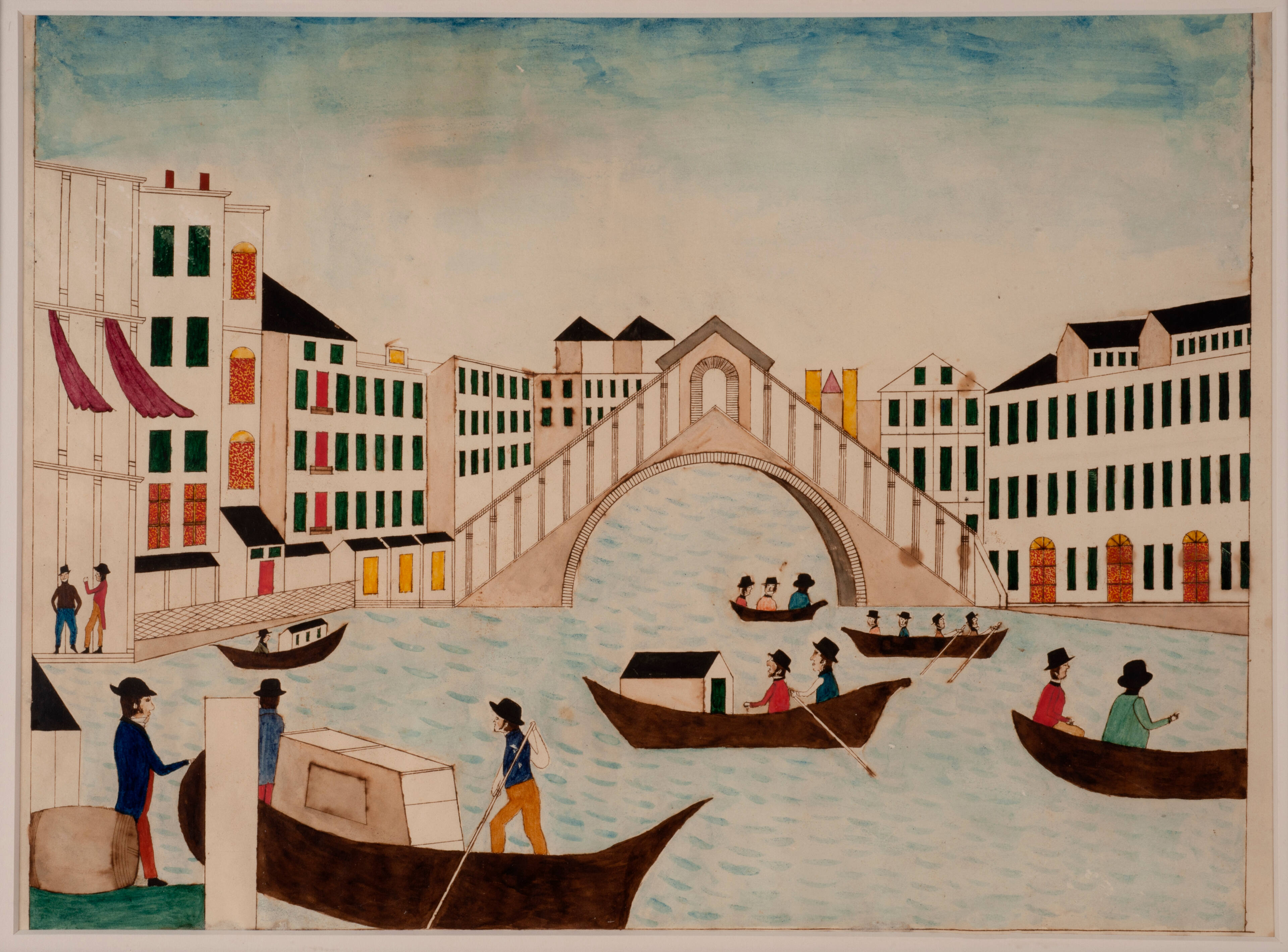 Label TextVenice has attracted American tourists and artists since the mid-nineteenth century. The fascination with the floating city and its noteriety made its way back to the United States with the returning tourists and through etchings and illustrations of the city's famous landmarks such as the bridge seen in this work. Schlaors presume this work was done by a school girl perhaps from a copy of an illustration of the Rialto Bridge, one of the more widely known landmarks of Venice. A curious inclusion in this piece is the clothing worn by the gondoliers and boaters, classic attire worn by New Englanders, this inclusion makes scholars believe that the artist never themselves went to Venice, but perhaps saw a souvenier illustration or etching and became inspired to make their own rendition. The bridge still stands today and attracts tourists from all across the world.Exhibition History“Folk Art from Cooperstown,” Museum of American Folk Art, New York, NY, March 29, 1966 – June 5, 1966.