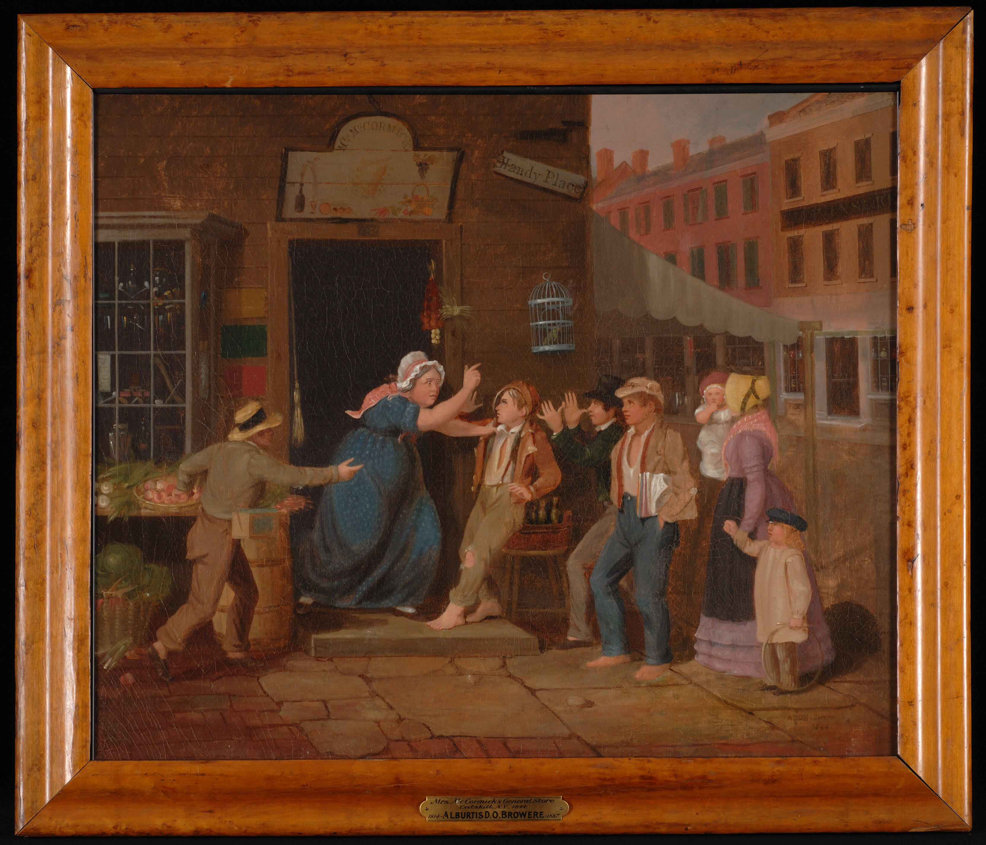 Label TextWhile young women were rarely rendered humorously in genre painting, older women were often the butt of a joke. Browere's hometown of Catskill, New York is the setting in which young boys plague a shopkeeper by shoplifting from her outdoor display. Much of Catskill's present-day business district remains the same as Browere's depiction, although a brick building now stands in the place of Mrs. McCormick's store. Browere's repertoire included sculpture, portraiture, landscapes, and later sign and wagon painting, but he is best remembered for his genre paintings derived from American literature.Exhibition History“Rediscovered Painters of Upstate New York, 1700-1875,” Fenimore Art Museum, Cooperstown, NY, June 14 – September 15, 1958; Rochester Memorial Art Gallery, Rochester, NY, September 26 – October 21, 1958; Albany Institute of History and Art, Albany, NY, October 30 – November 20, 1958; Munson-Williams-Proctor Institute, Utica, NY, November 30 – December 21, 1958; Syracuse Museum of Fine Arts, Syracuse, NY, January 4 – January 25, 1959; New York Historical Society, New York, NY, February 1 – February 28, 1959.