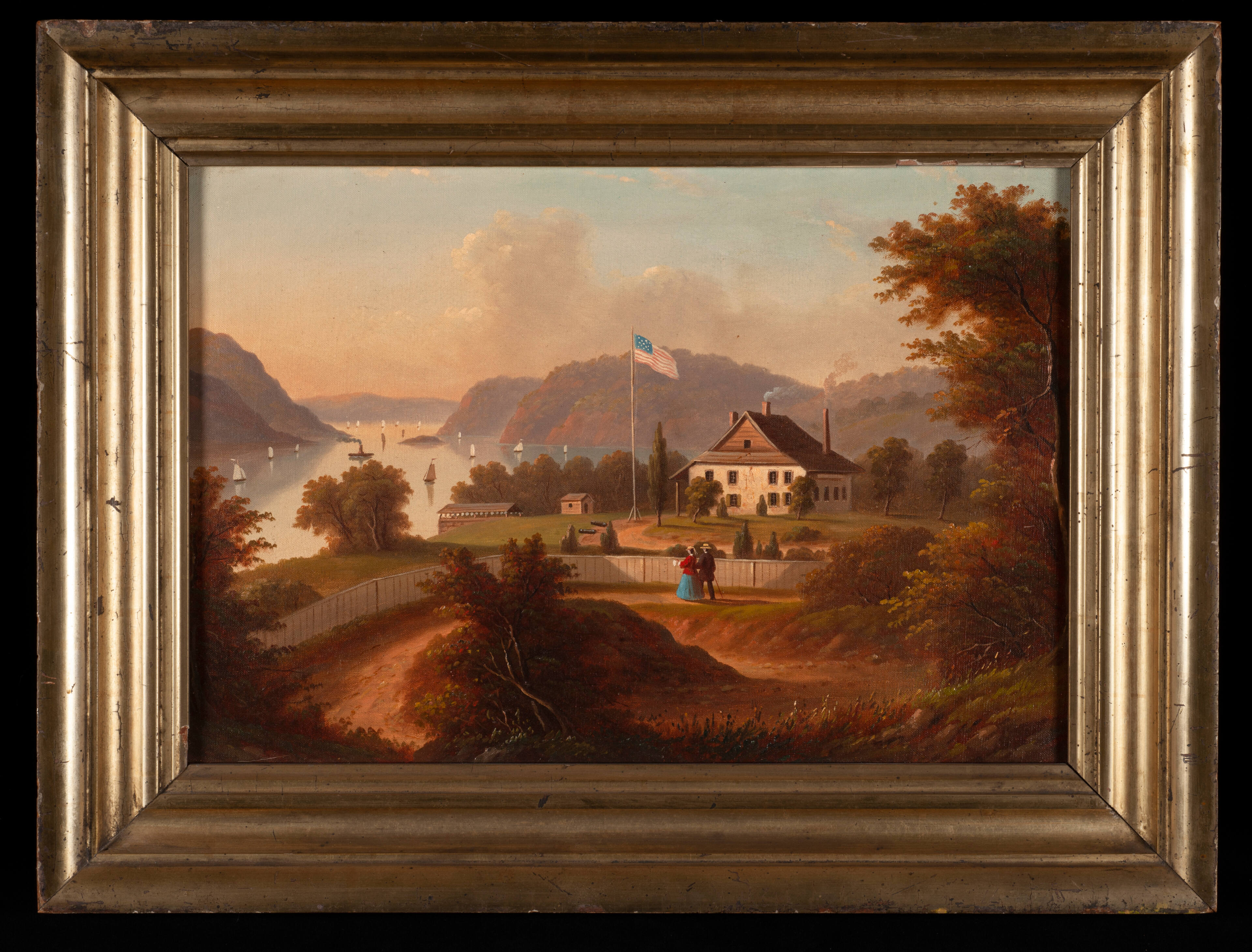 This view illustrates the house after it had become a state site. Part of the opening included raising the flag on the new flagpole and firing the cannon, visible on the front lawn. A variety of artists made paintings and prints of the house, DeGrailly creating one of the most picturesque with a developed foreground and the Hudson River visible in the background.