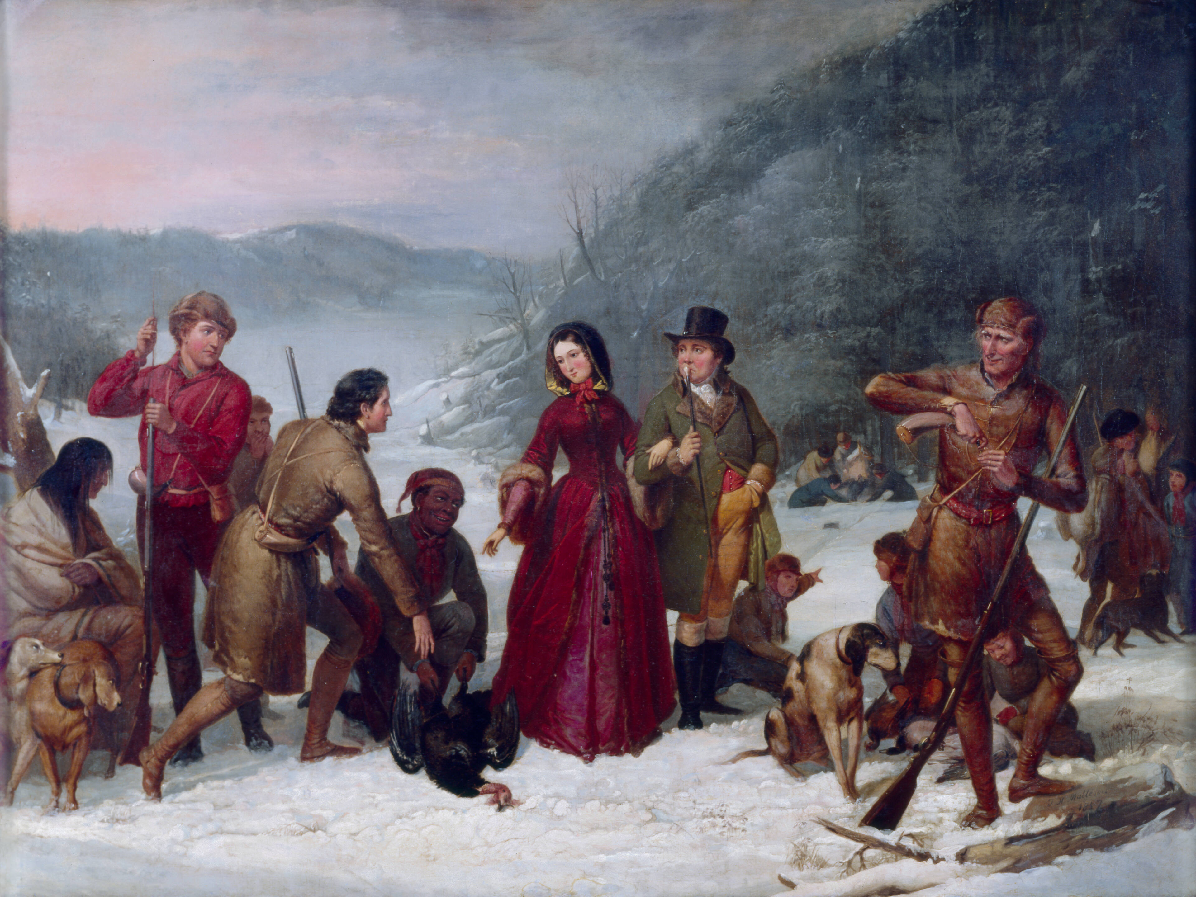 Label TextTompkins Harrison Matteson documented various aspects of upstate New York life in his genre paintings and recorded his generation's great interest in romantic novels and history in his works based on James Fenimore Cooper and other colonial period novels. "The Turkey Shoot" is taken from Cooper's novel The Pioneers and depicts an old custom held on Christmas day. A turkey was buried in the snow up to its neck, with the objective being to shoot the bobbing red head from a distance of 100 yards. Only a shot in the neck or head was counted as good, and each shot cost a shilling. Matteson captured the moment Leatherstocking (right) recharges his gun after shooting the bird. His beaten opponent is Billy Kirby (in red on left).Exhibition History“Rediscovered Painters of Upstate New York,” New York Historical Society, NY, February 1, 1959 – February 28, 1959; Syracuse Museum of Fine Arts, Syracuse, NY, January 4, 1959 – January 25, 1959; Munson-Williams-Proctor Arts Institute, Utica, NY, November 30, 1958 – December 21, 1958; Albany Institute of History and Art, Albany, NY, October 30, 1958 – November 20, 1958; Rochester Memorial Art Gallery, Rochester, NY, September 26, 1958 – October 21, 1958; New York State Historical Association, Cooperstown, NY, June 14, 1958 – September 15, 1958.
