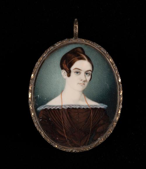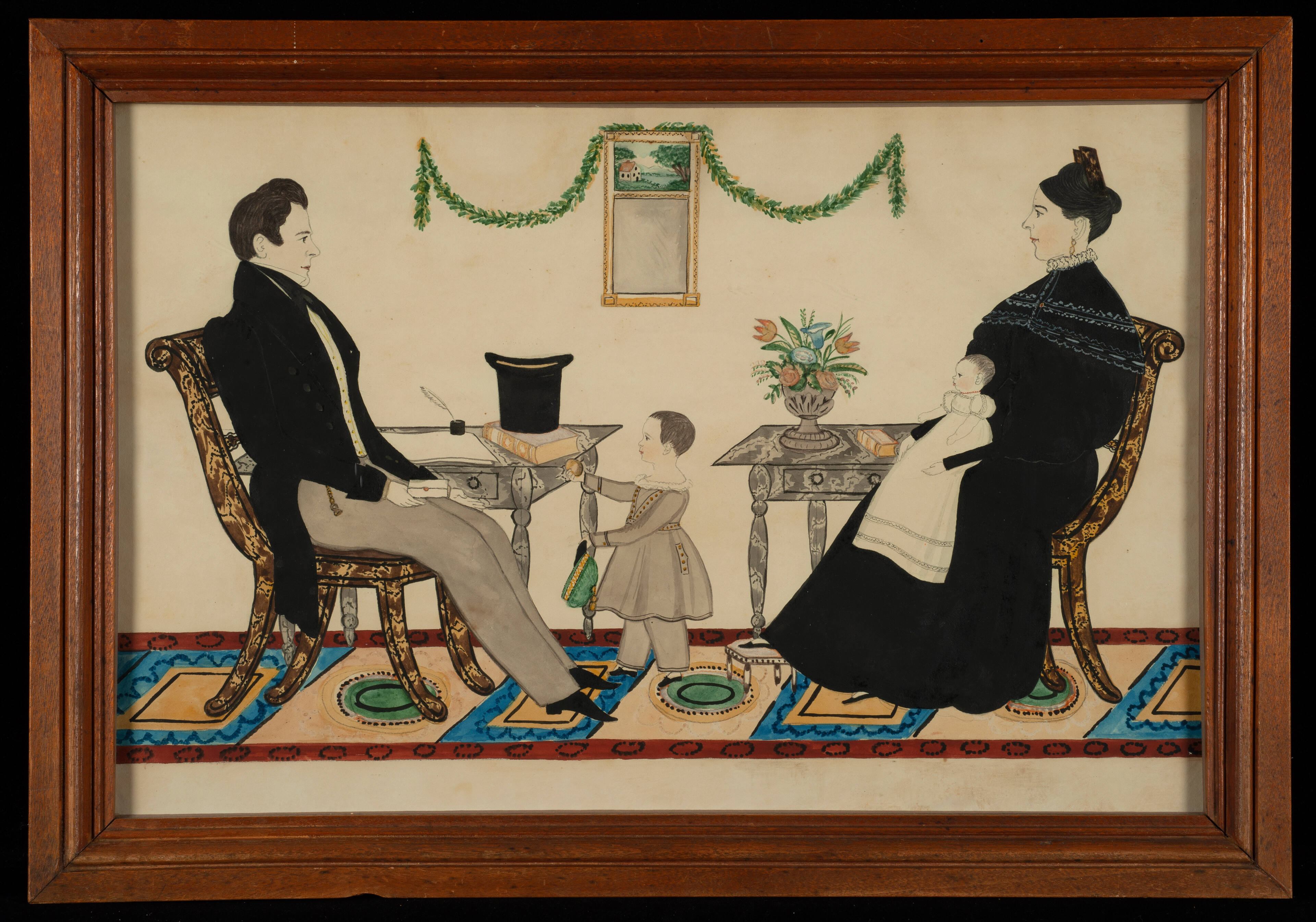 Label TextDavis's clientele included military officers, farmers, lawyers, schoolmasters and clergymen. In this group portrait of a handsome couple and their two children, Davis placed many refinements of a middle-class society on the tables, including a top hat, two books, a vase of flowers, a quill pen with inkstand and writing paper. Although he sought to record true likenesses, the portraits themselves do not seem to convey the sense of character found in the work of more skilled artists. Husband and wife are stiffly posed, as they gaze unblinkingly into each other's eyes, while their dutifully silent children gather by them. Just as Davis included symbols of a family's role in society, he seems to have made the subjects themselves symbols of refined New Englanders.BibliographyEye of the Collector: Works from the Lipman Collection of American Art (exh. cat. Arizona State University Art Museum, 1999).