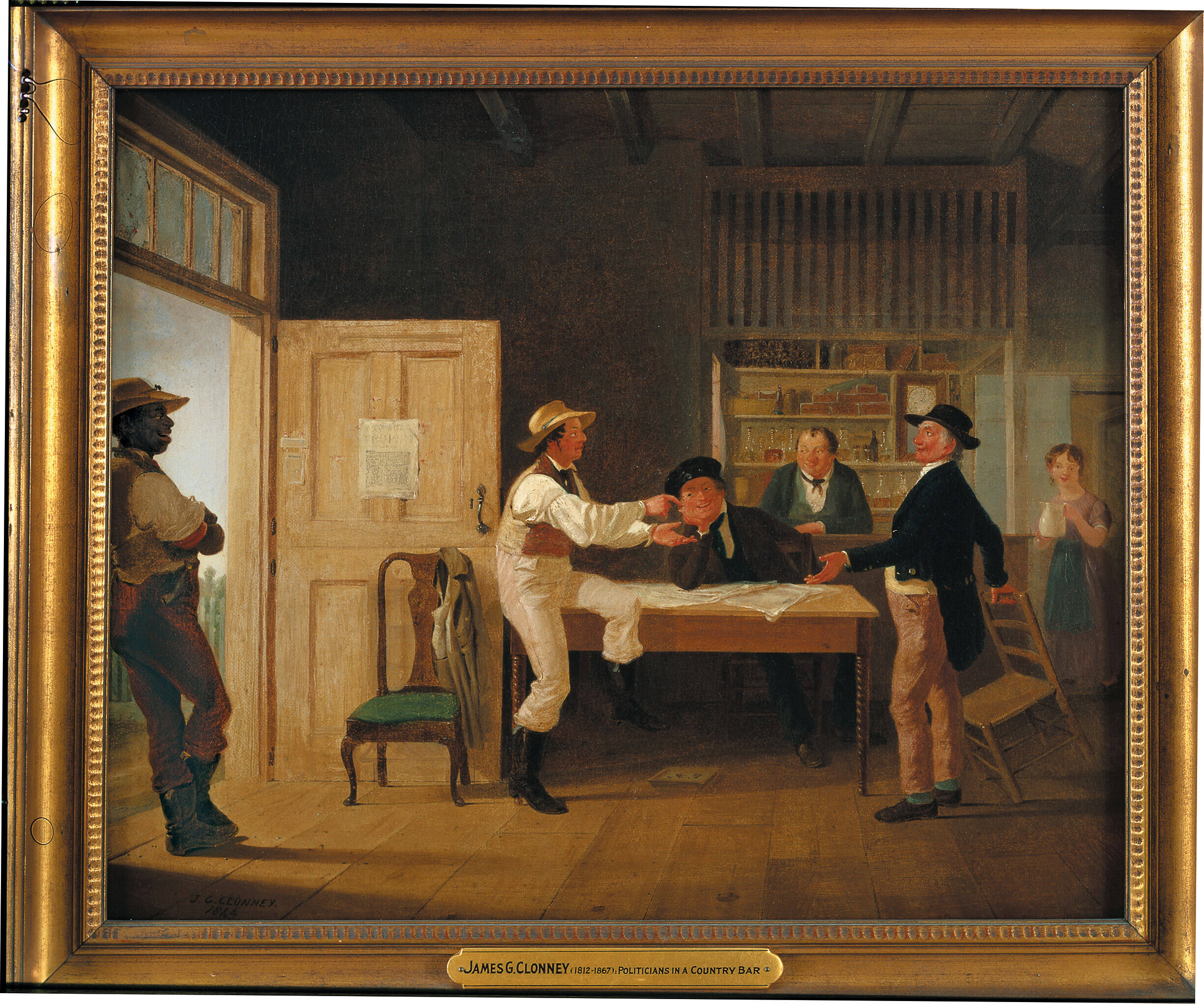 Label TextPolitical discussions, and indeed arguments, have always been a vital part of American life and regularly appear as the subject of paintings during the 19th century. Country taverns, a meeting place for both local residents and travelers, were often where opposing ideas met. Clonney's depiction of two antagonists arguing while amused bystanders look on represents American democracy at work. Even in this humorous rendition, however, Clonney reflects the real political and social status of women and African-Americans by placing these figures at the margins of the composition. Clonney's unsophisticated style, even spacing of forms, and flat modeling contrast with the more complex work of his peers, yet his simplicity captures an accurate glimpse of rural 19th-century life.Exhibition History“Rediscovered Painters of Upstate New York,” New York Historical Society, NY, February 1, 1959 – February 28, 1959; Syracuse Museum of Fine Arts, Syracuse, NY, January 4, 1959 – January 25, 1959; Munson-Williams-Proctor Arts Institute, Utica, NY, November 30, 1958 – December 21, 1958; Albany Institute of History and Art, Albany, NY, October 30, 1958 – November 20, 1958; Rochester Memorial Art Gallery, Rochester, NY, September 26, 1958 – October 21, 1958; New York State Historical Association, Cooperstown, NY, June 14, 1958 – September 15, 1958.