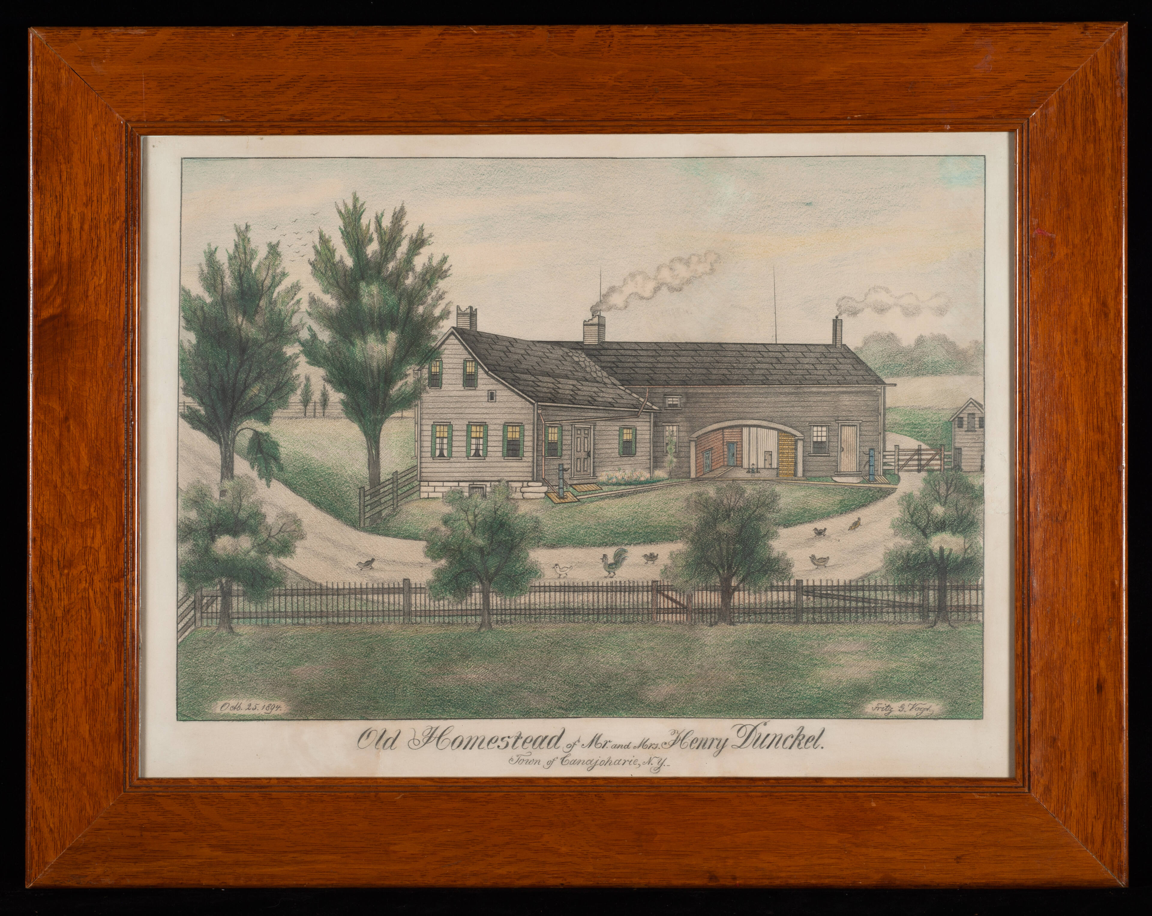 Vogt occasionally produced drawings that represented an older version of a farm or residence. This “Old Homestead” could be one such drawing. Henry Dunckel (1826-1881) was deceased when this drawing was produced. Did his wife Eliza (Garlock) Dunckel (1828-1895) or one of their children as Vogt to create and title this drawing?