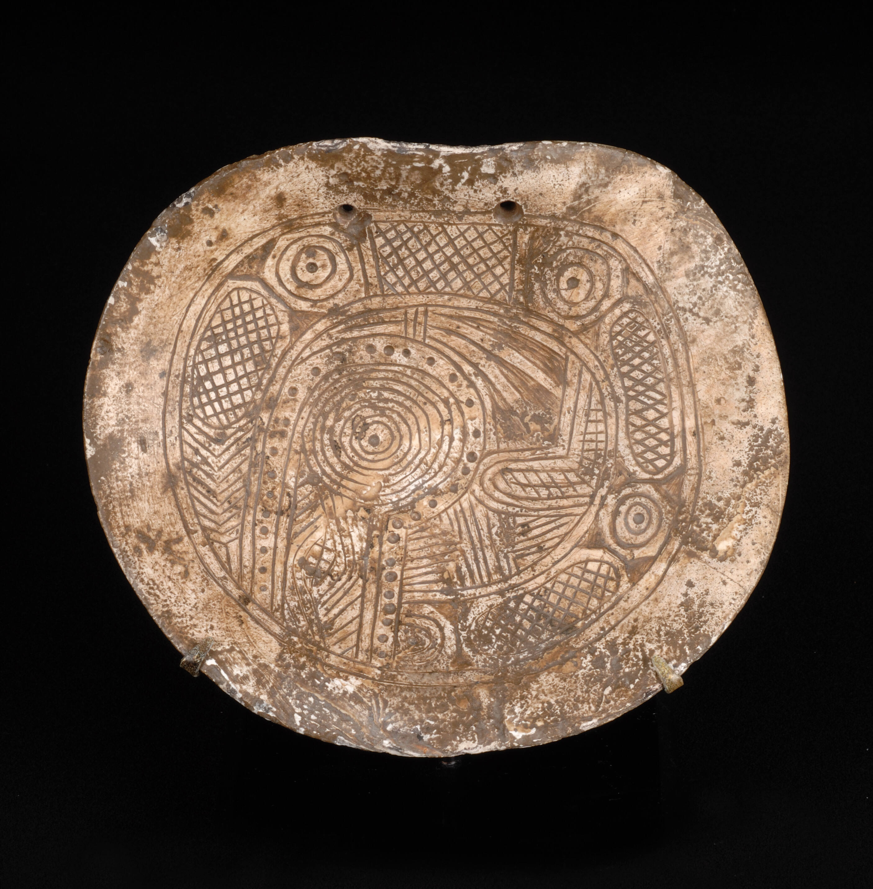 Label TextThe discovery of this gorget at the site of this historical village does not imply a Cherokee origin; these objects may predate the local settlement of Cherokee Indians. Engraved in the regional Citico stytle, the conventional image represents a coiled rattlesnake, its large eye in the center beside the mouth full of teeth. Behind the eye, a group of V-shaped lines at the end of the snake's tail represents its rattles. Two small holes served to attach the gorget to a necklace.ProvenanceJohn Parker, Tennessee, 1970s; Toby Herbst, Santa Fe, New Mexico