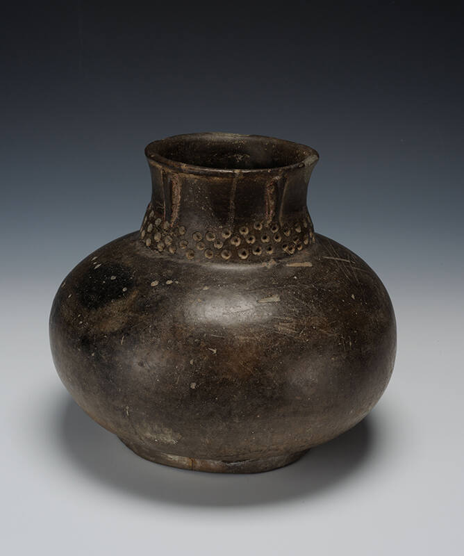 Label TextThese bottles with punctated, appliqued strips and punctuations on the lower neck are known as Carson Lake Punctated and may reflect a distinct pottery workshop or a short-lived sodality that produced a limited number of bottles.ProvenancePrivate collection