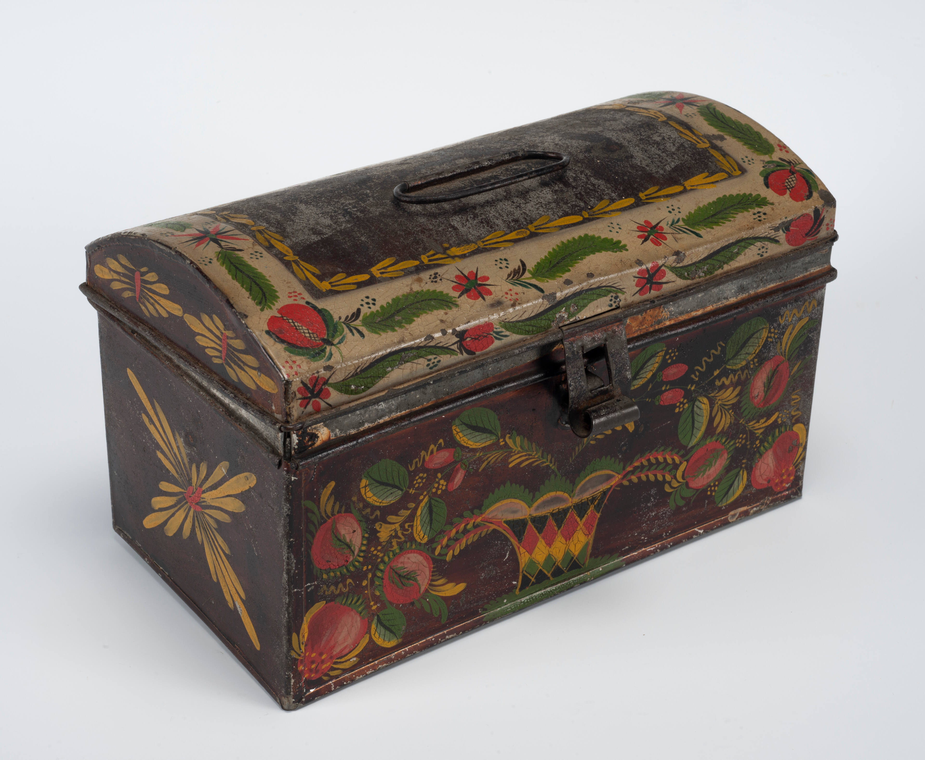 Label TextWomen often supplied the painted decoration in family-owned tinsmith shops. The decoration on this trunk relates closely to the artist’s watercolor still life also in this exhibition.BibliographyMargaret Coffin, The History and Folklore of American Tinware 1700-1900 (New York, 1968), p. 130.