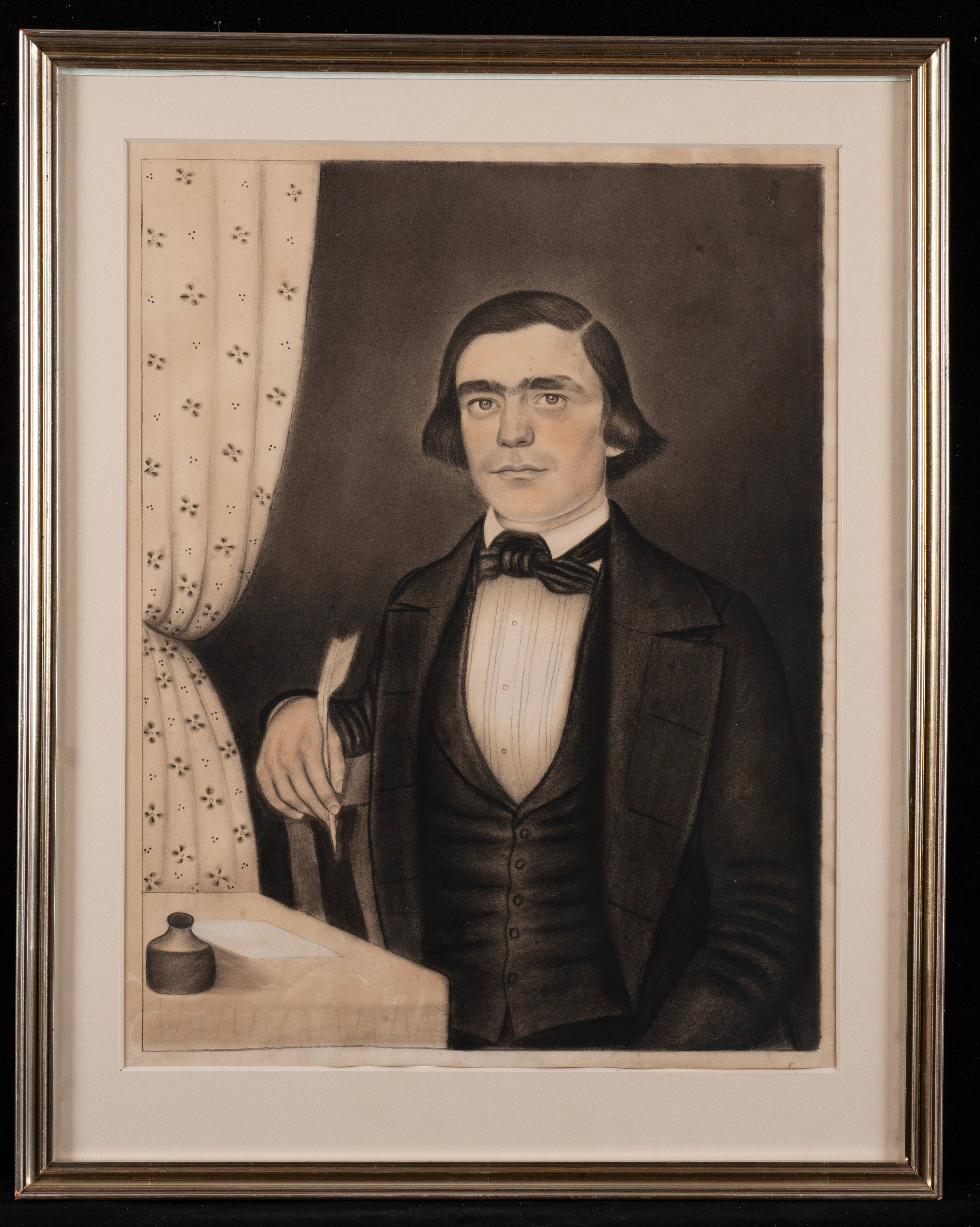 Label TextThis modest likeness of Dr. Nash sitting next to a writing table with quill pen in hand is executed with sensitivity and skill despite the awkwardly foreshortened arm draped over the chair. The patterned drapery at the left side of the picture adds decoration to this otherwise plain and monochromatic portrait. The artist captured a distinctive feature of this sitter when he drew the continuous line of eyebrow across the subject's forehead.