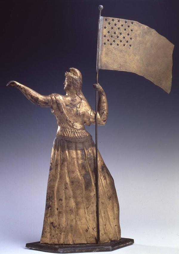 Label TextIn 1867 Leonard Cushing, a civil engineer who managed a machine shop in a watch factory, and Stillman White, one of his machinists, purchased a weathervane business from the estate of Alvin Jewell. They expanded the line of offerings and, under the name of Cushing and White, became synonymous with quality copper weathervanes. In 1872 White sold his share of the business to Cushing, who brought his sons into the partnership and continued on as L. W. Cushing and Sons until 1933. This Goddess of Liberty weathervane was patented in 1865, possibly by Jewell, and was available in a variety of sizes—up to sixty inches tall—in Cushing’s catalogues.Exhibition History“American Folk Art: Collection from the Fenimore Art Museum,” Mona Bismarck Foundation, Paris, France, January 25, 2001 – March 24, 2001.