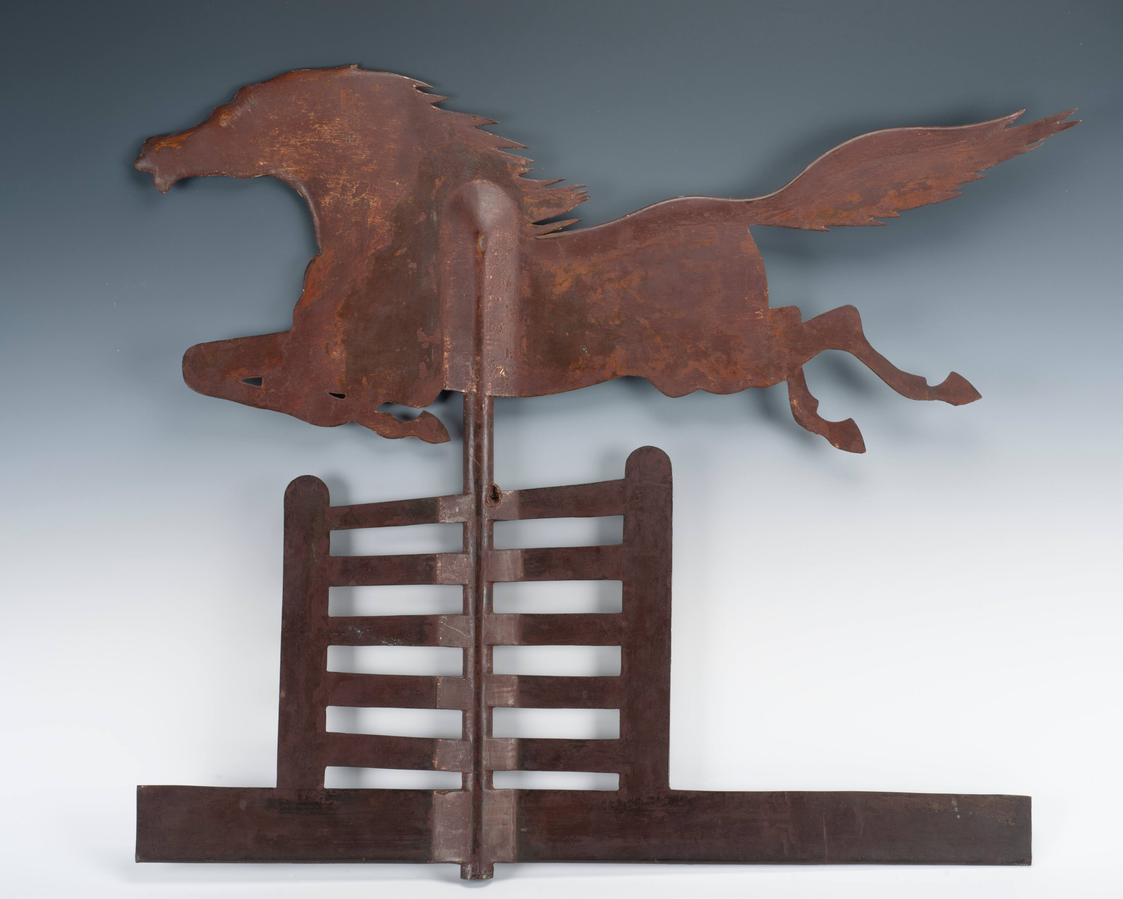 Label TextWeathervanes of horses, like the others in this group, were designed and produced in the mid- and late- 19th century when the rise in popularity of horse breeding, driving, and racing coincided with the development of the commercial weathervane industry. Alvin Jewell, of Waltham, Massachusetts, was one of the pioneers of manufactured weathervanes. He offered this pattern in gilded copper beginning in the 1850s. His patterns were continued by L.W. Cushing and Stillman White. This weathervane is a sheet-metal copy of Jewell's weathervane by an anonymous metalworker.Exhibition History“American Folk Art: Collection from the Fenimore Art Museum,” Mona Bismarck Foundation, Paris, France, January 25, 2001 – March 24, 2001.