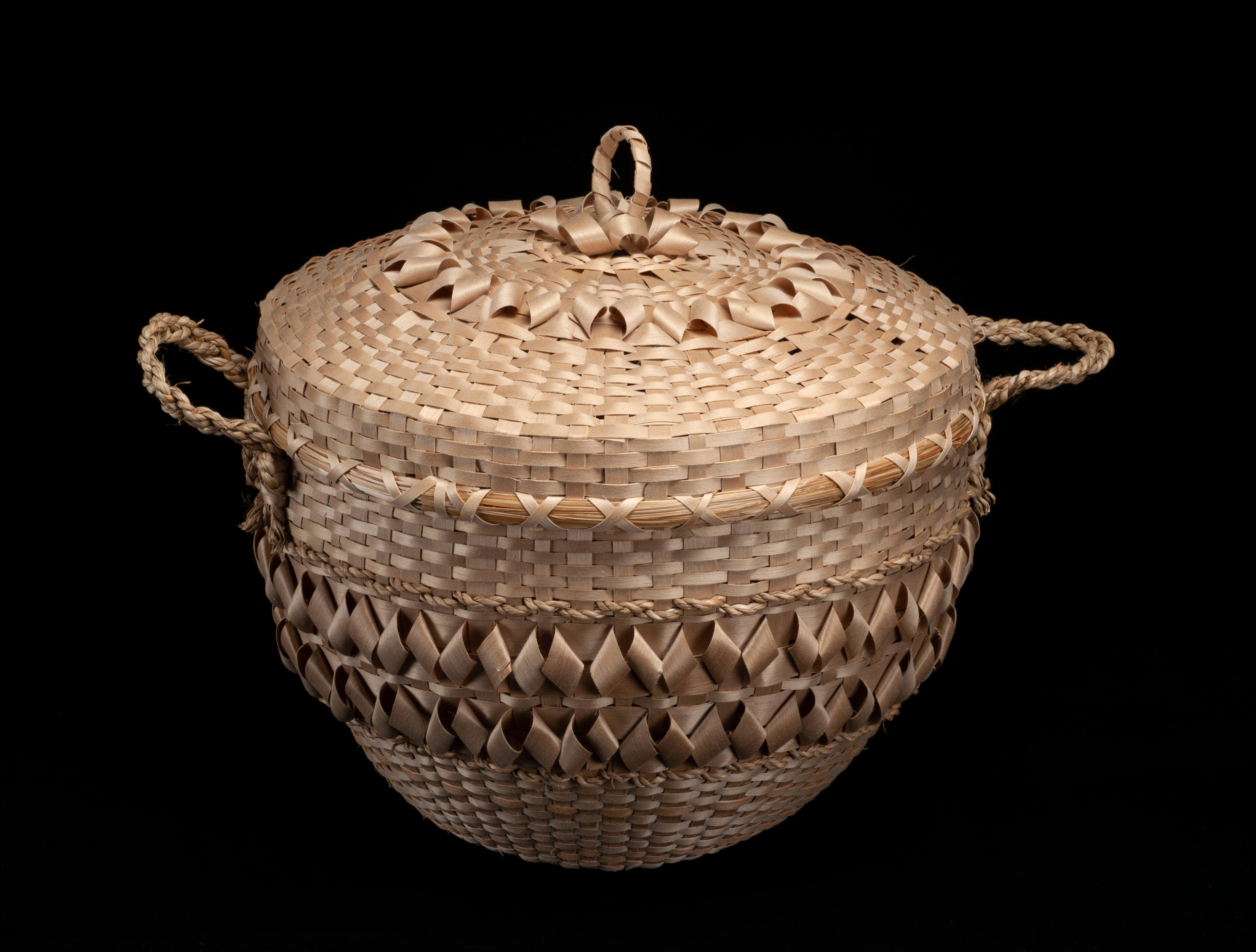 Label TextCharlotte Morey’s work is a testament to the time-honored Iroquois traditions of weaving bands of black ash splint basketry. Sweet grass is well-known for its satisfying fragrance, but it also provides a textural contrast to the smooth surface of the natural, undyed black ash splint. Morey has used twisted sweet grass to create the handles and it is interwoven between the splints as well. One of the most appealing features of the basket is the imbrication of the black ash splint. Here imbrication is used to create a fancy twist on the surface of the basket. Imbrication is not a part of the structure of the basket as it is inserted only onto the surface.ProvenanceGift of the artist, Charlotte Morey, in honor of the Opening of the American Indian Wing, St. Regis Reservation, New York, July, 1995