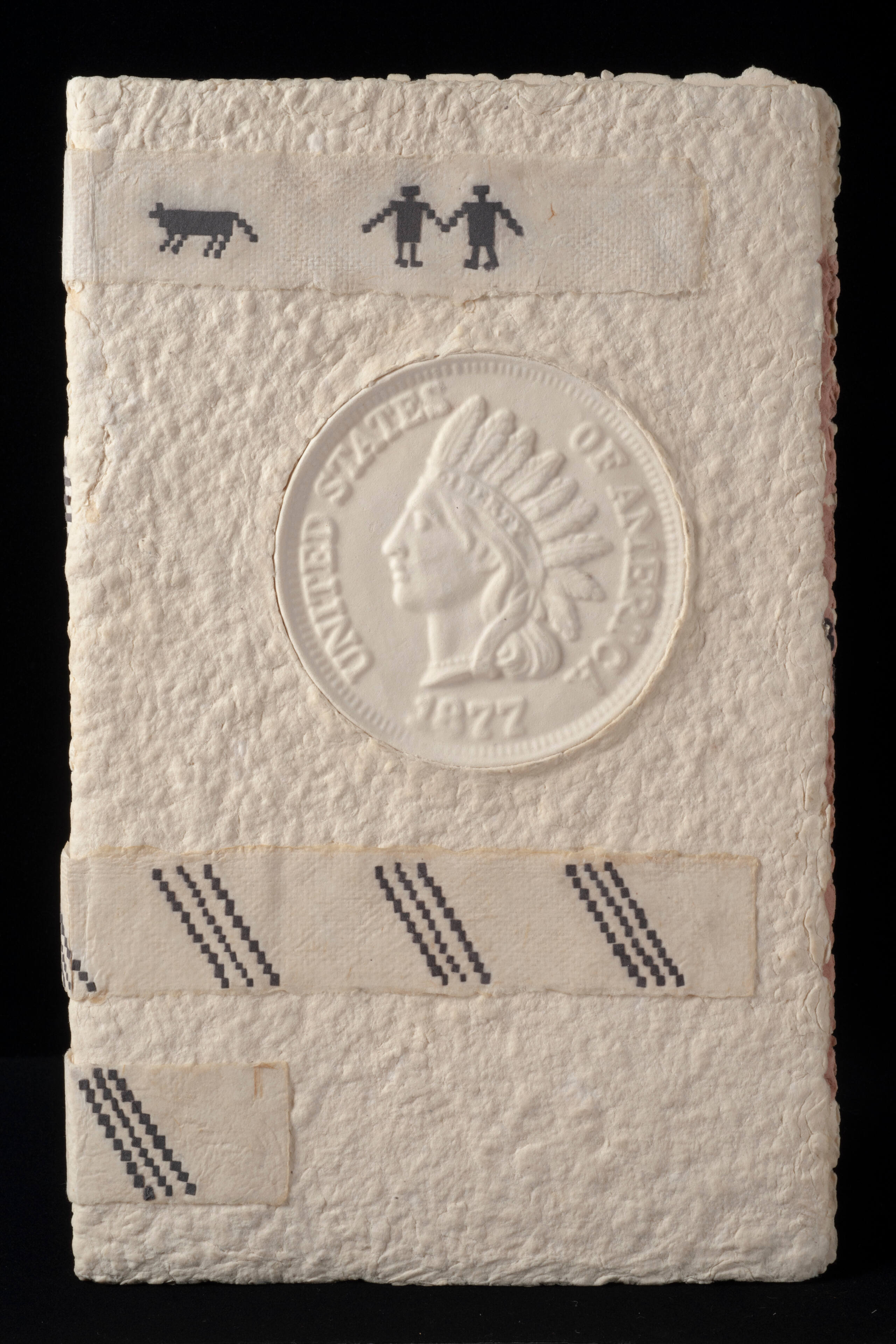 Label TextRoger Parish's book serves as a commentary on early treaties struck between the colonies and the Haudenosaunee. The front and back covers feature oversized Indian coins and stylized patterns that reference wampum belts. Between the handmade pages of the book is a representation of the George Washington Confederation Treaty Wampum Belt that guaranteed peace and friendship between the two groups. Set into the wampum belt are figures drawn in black ink to signify signers of the treaty.Exhibition History"0’nigoe:yo:h:h: Thinking In Indian", University of Buffalo Art Gallery, SUNY Buffalo, Buffalo, NY, July 16, 2022 - October 2, 2022.