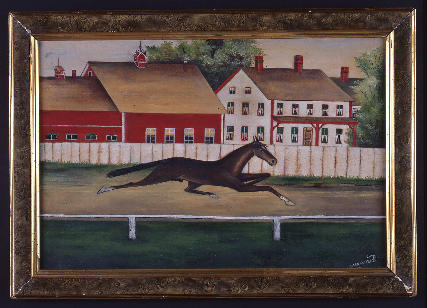 One of the true greats of harness racing, and among the first seven "Immortals" to be elected to the Hall of Fame of the Trotter at Goshen, NY, he was champion of the world as a yearling, a two year old (2:04 1.2), a three year old (2:03 1/2), and a four year old (2:02). Nineteen thirteen was his great year; he was the fastest two year old in history and even broke the world's record for three year olds - an incredible feat. As a three year old himself, he broke "all records for trotting stallions of any age for three consecutive heats," and lowered the world's record for a mile to 2:03 1/2 to become the "sixth fastest trotting stallion of any age in history." Nineteen fourteen saw Peter's downfall; he set a new world's record, but also sustained his first defeat. After his loss to Lee Axworthy, he was retired to Patchen Wilkes Farm.BibliographyLouis C. Jones and Agnes Halsey, New-Found Folk Art of the Young Republic (exh. cat., Cooperstown, NY, NYSHA, 1960), p. 30.