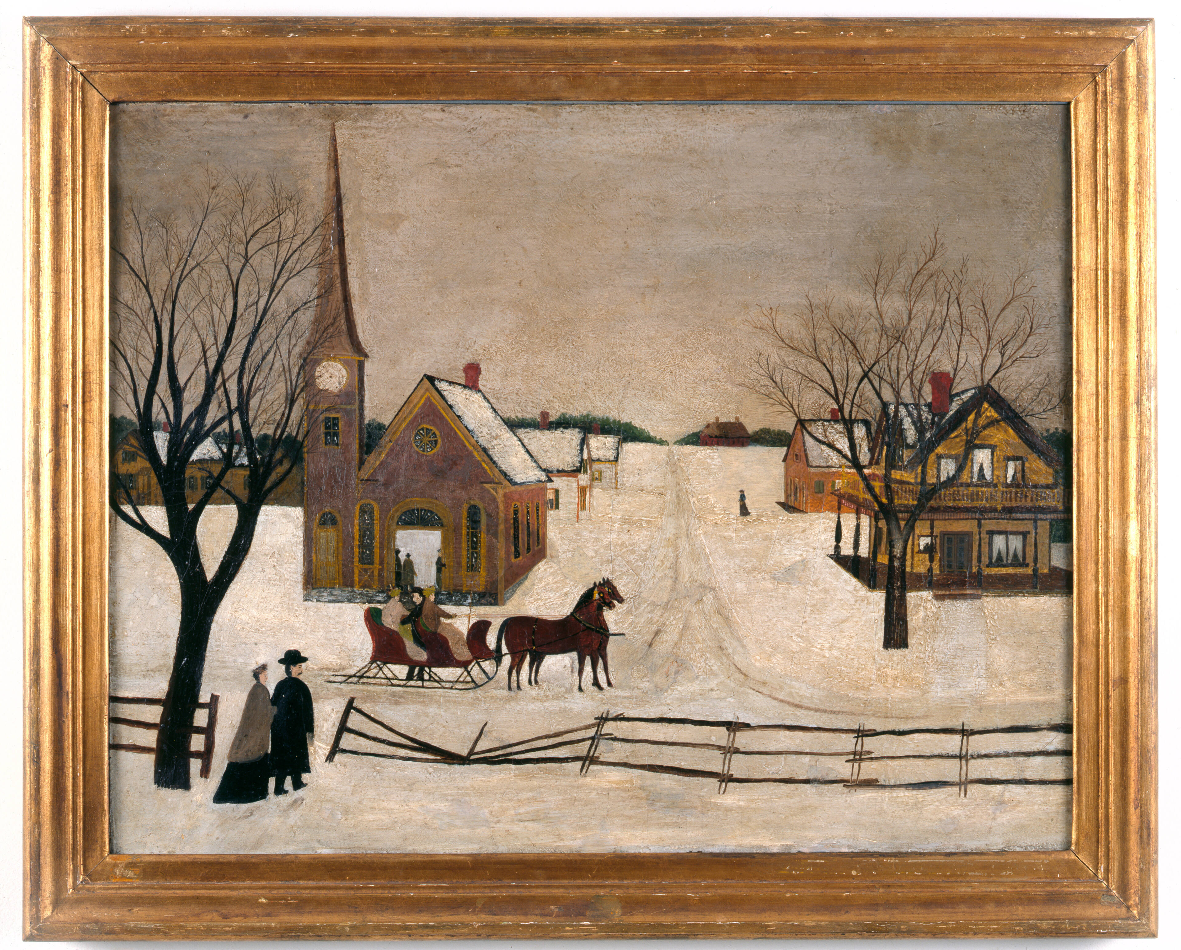 Label TextWhile many folk artists found inspiration in their surroundings or from personal memories, some looked to other artists' work for ideas. It is believed that this painting is based on a print of a similar winter scene. Imitating the composition of the print, the artist created his or her own winter scene with a universal, timeless appeal when sleighing was a primary means of winter transportation.Exhibition History“The Flowering of American Folk Art,” M.H. de Young Memorial Museum, San Francisco, CA, June 24, 1974 – September 15, 1974; Virginia Museum of Fine Arts, Richmond, VA, April 22, 1974 – June 2, 1974; The Whitney Museum of Art, New York, NY, February 1, 1974 – March 24, 1974.