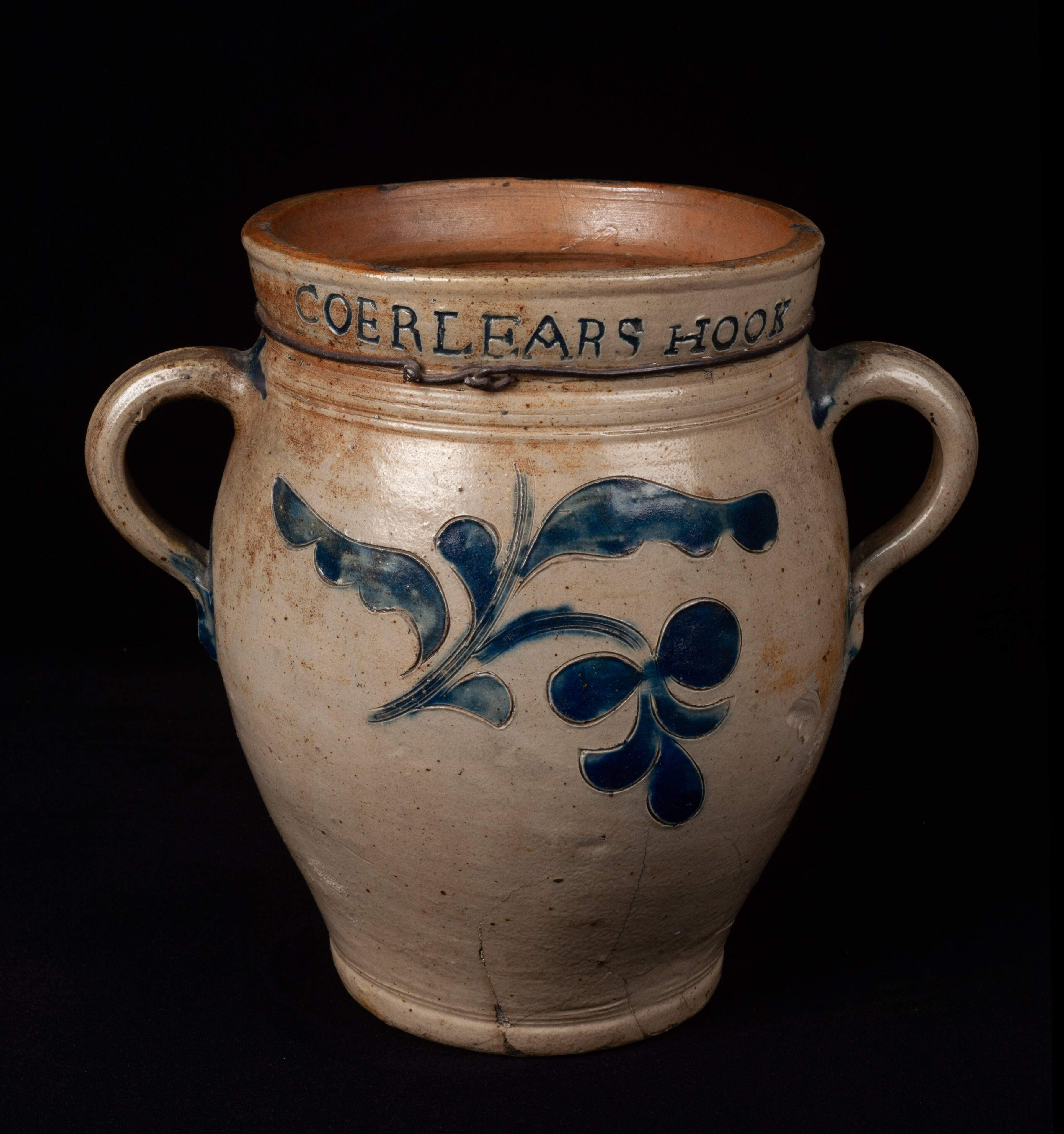 Label TextFor two centuries, the story of craftsman Thomas W. Commeraw was lost to history. Born enslaved, Commeraw rose to prominence as a free Black entrepreneur with a thriving pottery at Corlaer’s Hook on Manhattan’s Lower East Side. Between the late 1790s and 1819, Commeraw produced thousands of utilitarian stoneware jars and jugs, marking them boldly with his name and his distinctive decoration. Surviving vessels attest to his skill at the potter’s wheel, while historical records document his activities as a business owner, family man, and engaged citizen. After a series of economic reversals forced him out of business, Commeraw made the fateful decision in 1820 to leave the U.S. and seek better opportunities in Sierra Leone, Africa.The distinctive incised flowers and unusual spelling of “COERLEARS” mark this jar as an early Commeraw example. A resourceful early owner of the jar added the wire collar to stabilize the cracks and extend the life of their valued possession.
