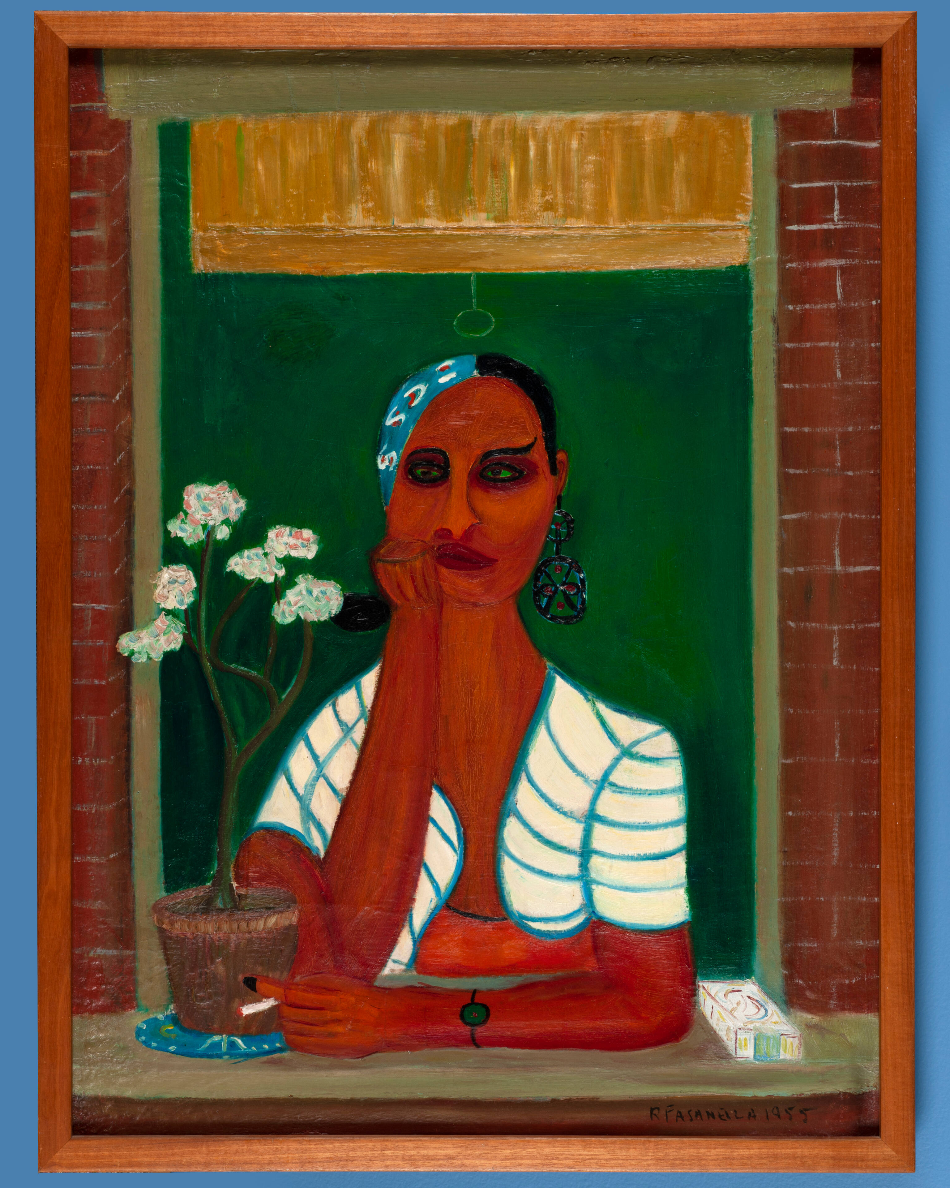 Label TextFasanella rarely used windows as a framing device for portraits unless he was incorporating small likenesses of people into his larger works by posing individuals in the windows of tenement buildings. Latin Lady in a Window is an unusual example of a window portrait on a larger scale. Fasanella later recalled that the woman was from Puerto Rico and ran a business in the Red Hook section of Brooklyn in the early 1930s, when he was still a teenager. Fasanella’s long-standing affinity for Black and Puerto Rican working-class neighborhoods stems from his childhood delivering ice with his father, and later working as a truck driver in Brooklyn and owning a gas station in the Bronx.On View