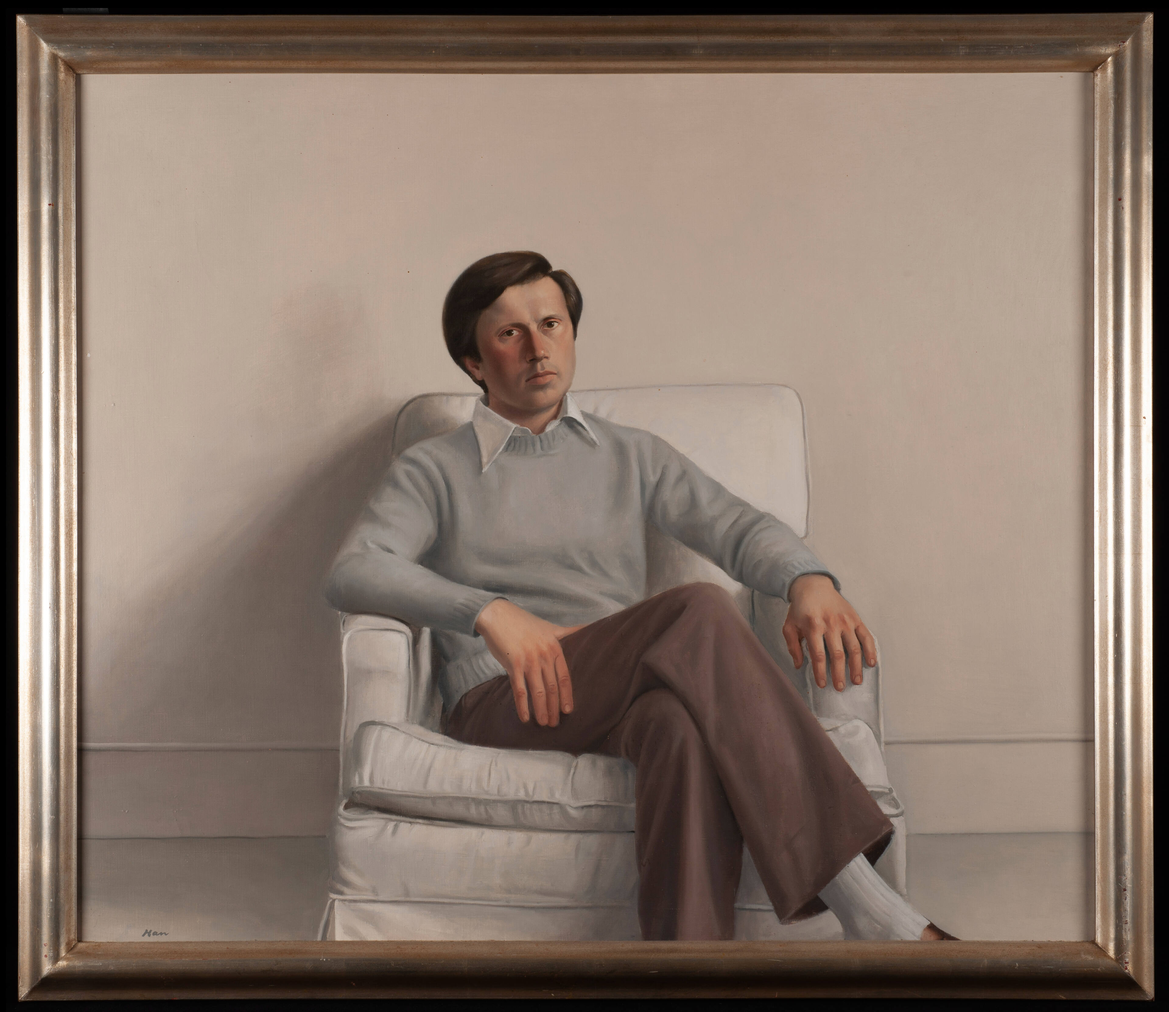 Label TextIn this portrait of the artist’s partner, Han depicts Paul Kellogg with his legs crossed, seated in a cushioned white chair, against a blank background. Although Han is best known for his still life work, his depictions of the human figure are as equally serene and carefully composed. Paul is rendered with a sensitivity to detail and a muted palette of light grey, white, and brown. These stylistic choices are used repeatedly by Han to create a sense of calmness in his work.On View