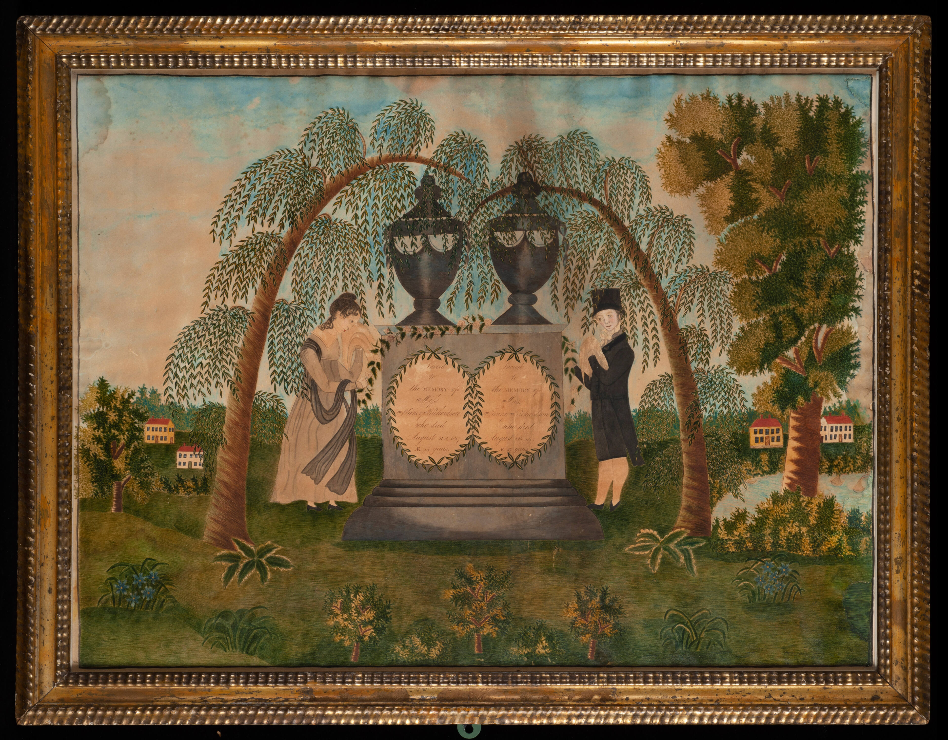 Label TextHarriet Moore was a teacher in the Concord, Massachusetts public school system. During the early 19th century, women painted and embroidered countless scenes honoring departed friends and relatives. They were an expression of the universality of death and a belief in eternal life with a promise of heavenly reunion. Frequently an important part of the curriculum in female seminaries, these mourning pictures derived from late 18th century European and English design sources and typically included grieving figures, funeral urns, and weeping willows.Exhibition History“American Primitive Art,” Museum of Fine Arts of Houston, Houston, TX, January 6, 1956 – January 29, 1956.