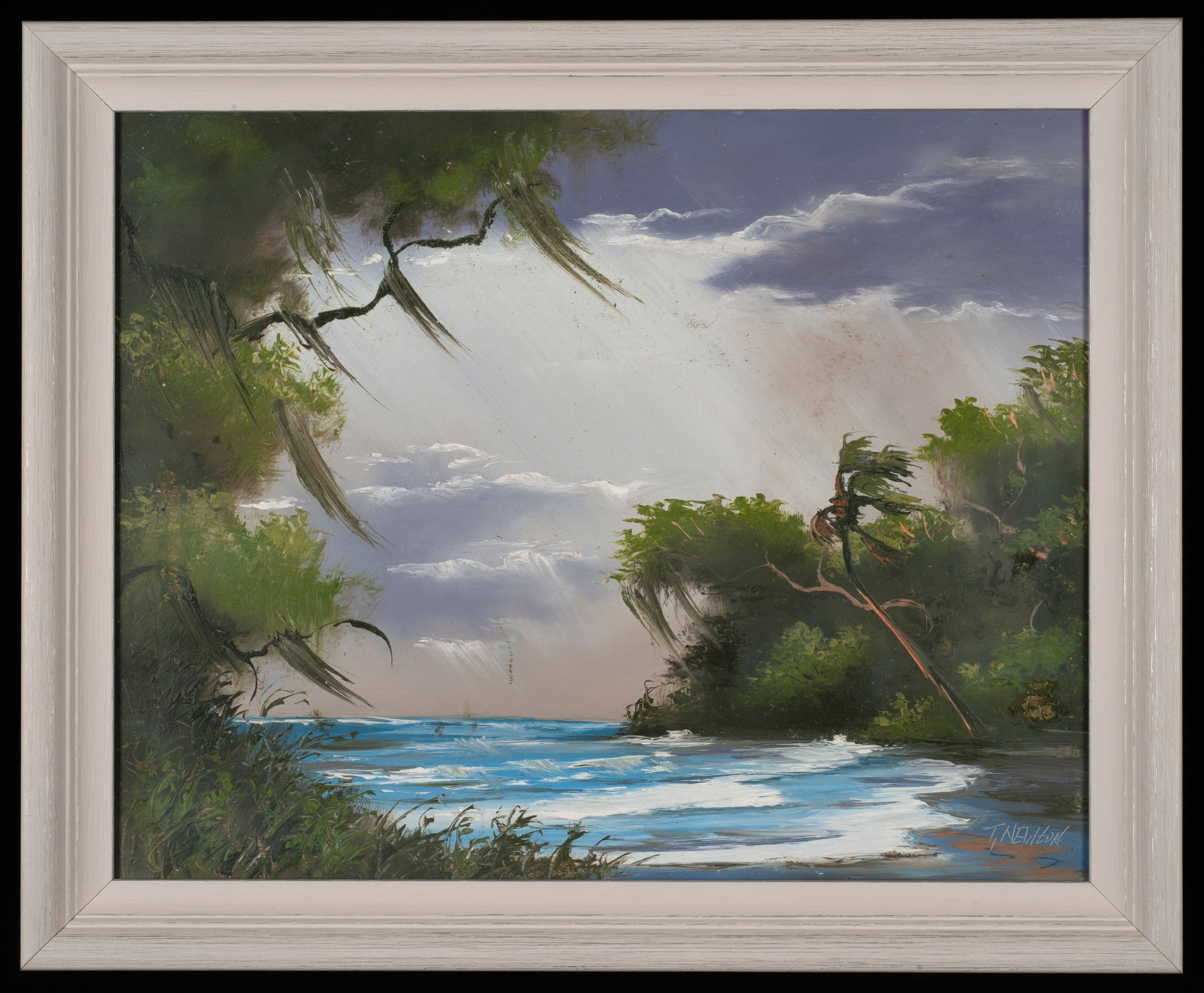 Label TextTracy Newton is the son of Sam Newton and the nephew of Harold and Lemuel Newton, all three of whom were original Florida Highwaymen. The second generation of Highwaymen has its roots in 1973 and like the first generation relies on self-taught artists working with friends and family to sell their paintings out of the trunks of their cars or on the street to pedestrians. Newton’s landscape, done in the same style as his predecessors, depicts the changeable Floridian weather as a storm rolling in on the Atlantic Ocean. Like the first generation of Highwaymen painters, Newton paints an idealized Florida that removes people and contemporary buildings.On View