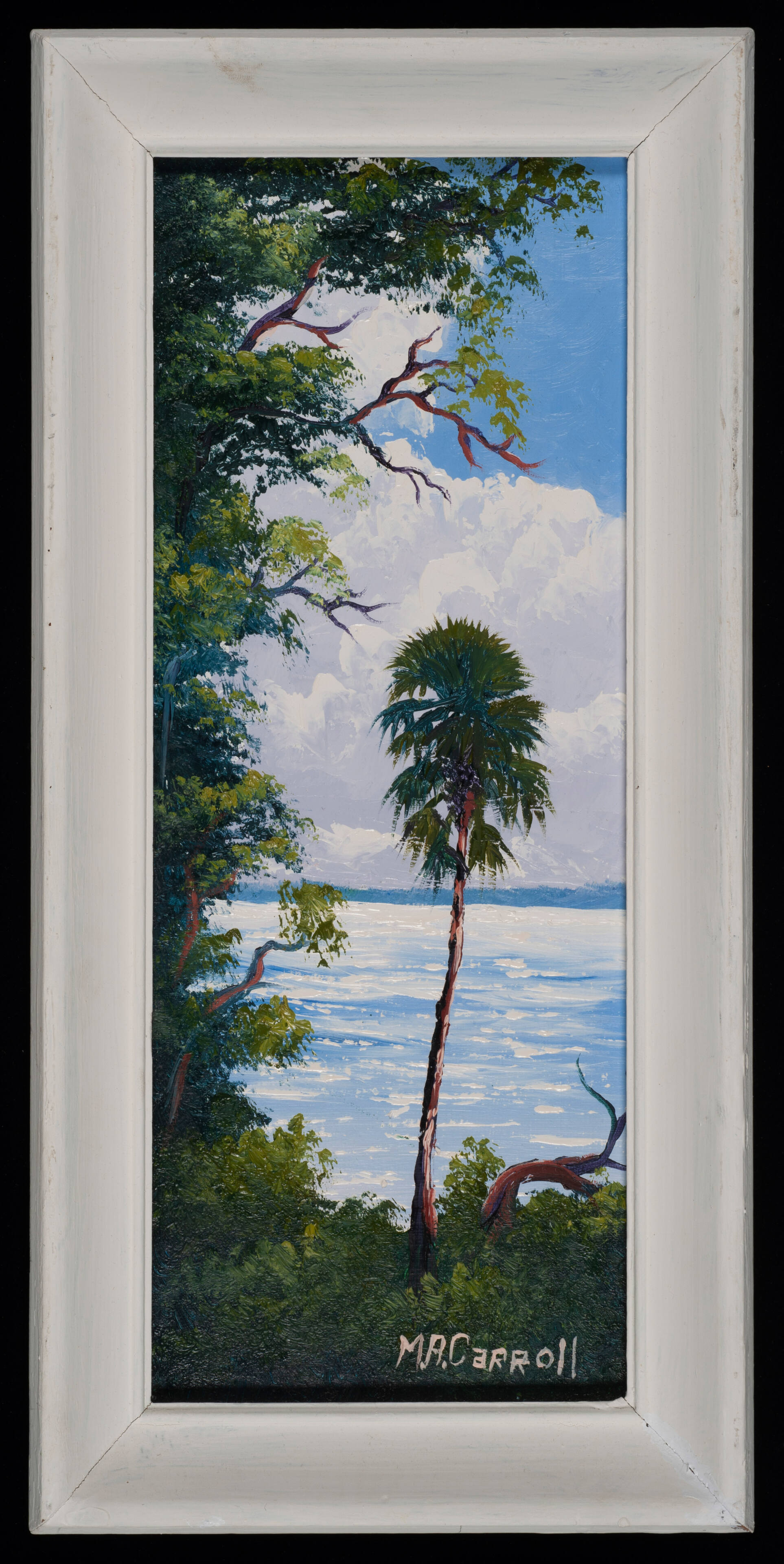 Label TextMary Ann Carroll was born in Sandersville, Georgia and grew up in Fort Pierce, Florida. She always enjoyed drawing, but became interested in painting when she met Harold Newton, one of the first Highwaymen. She was the only woman of the group and while painting, raised seven children and worked numerous odd jobs. This painting depicts a singular palm tree surrounded by lush greenery and the inviting blue waters of the ocean. There are no beachgoers or boats on the waterline, giving the viewer an uninterrupted view of Florida’s beauty. Mary Ann painted for the entirety of her adult life, often offering the advice that, “you must believe in yourself, even if no one else does.”