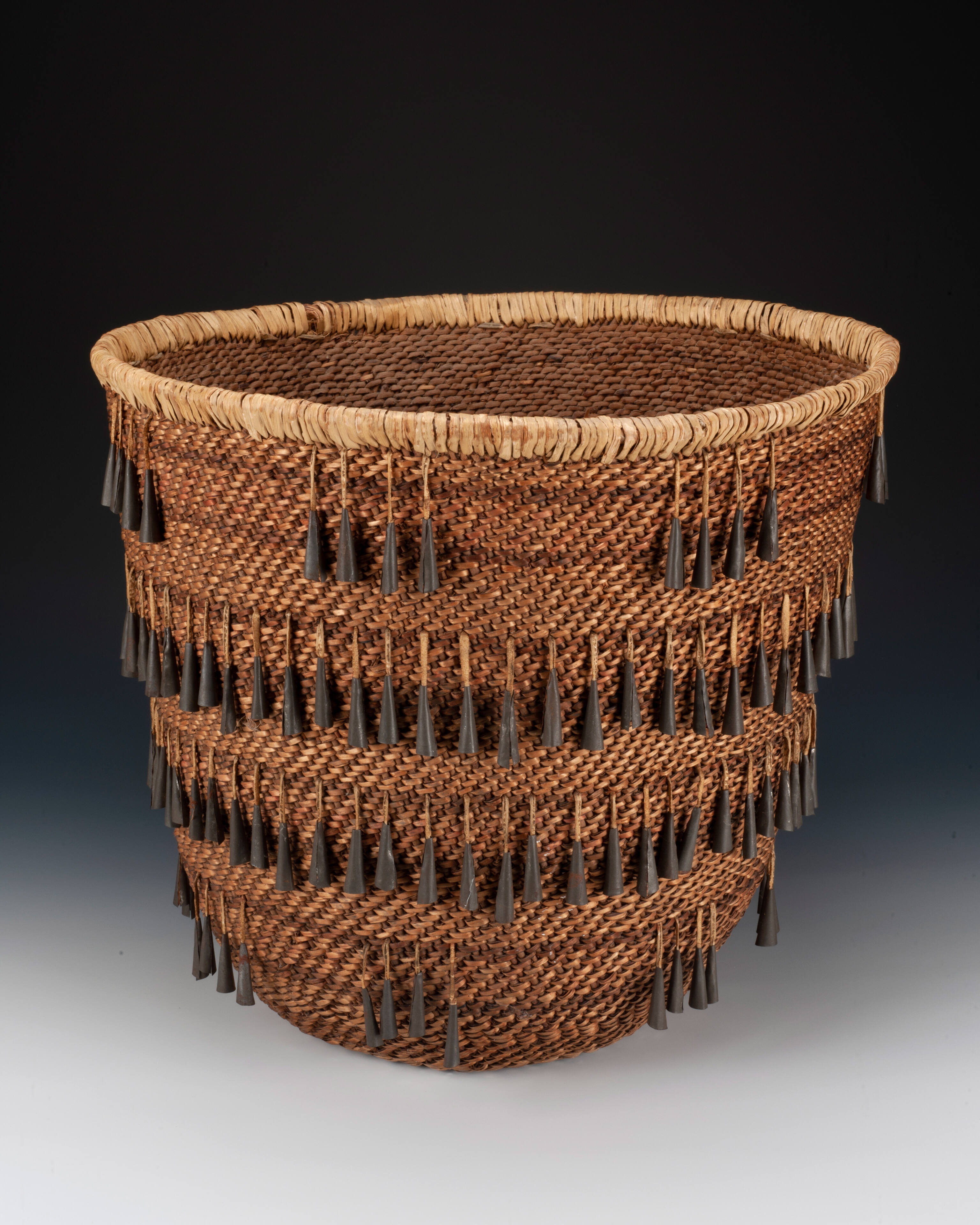 Label TextThe art of basketry is highly treasured in Apache culture. This basket is a burden basket; traditionally formed in a cone shape with a flat, rounded bottom. The tin cones circling the basket form a decorative element, but their jingling noise has been said to scare off snakes. Apache women were almost always the weavers of burden baskets, which were used to carry firewood, roots, berries, and tools.On View