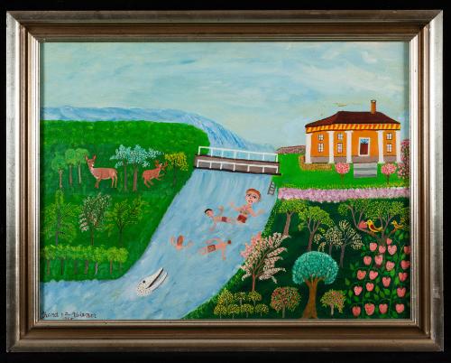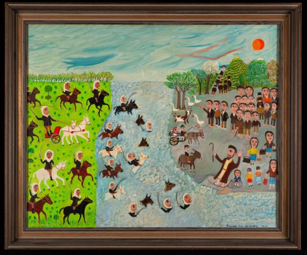 Label TextA self-proclaimed incurable optimist, Isidor Wiener came to the United States in 1903 to escape Jewish persecution in Romania. When his wife died in 1950, his son encouraged him to paint to relieve his grief. Wiener quickly became one of the most prominent folk artists of the 20th century, painting scenes of Eastern Europe, his Jewish heritage, Biblical stories, and his life in New York City. He was successful in translating personal values, impressions, and inspirations into paintings that hold universal appeal. On View