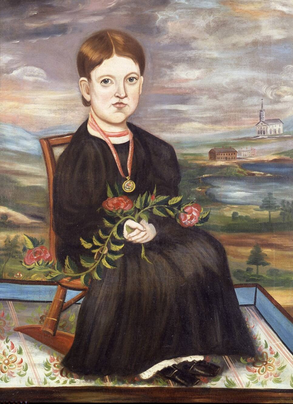 Label TextRather than present the subject in a realistic interior setting, this artist created a personal, almost psychological vision. Eliza sits in a rocking chair, in an imaginary room that appears to float mysteriously over a murky landscape scene. The carpeted floor seems to be rendered in the shape of a large tray, with the front side visible as a strip of brown paint appearing along the lower margin of the canvas. This seemingly surrealistic interpretation creates an incongruous relationship between the interior setting and the landscape background. The structures depicted in the background of the portrait remain unidentified.Eliza Smith was born on April 4, 1831. She was the youngest child of Alaston and Eliza Guild Smith who lived on Stewart Street in Providence, Rhode Island, and was the only one of their five children to survive infancy. Eliza Smith graduated from Rhode Island Normal School and went on to teach classes in various local Providence school districts from 1860 to 1889. She consistently won praise from local school committees for her teaching abilities. Never married, Eliza died at the age of seventy on July 16, 1901, and is buried in the Smith family plot at Grace Church Cemetery in Providence. Her personal possessions, including this portrait, were willed to friends, as she had no descendants to inherit her property.