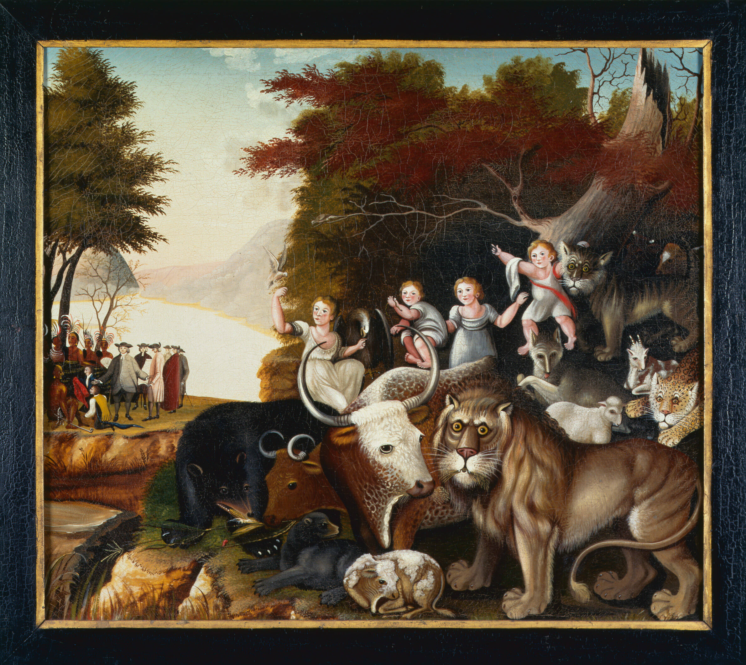 Label TextEdward Hicks was born into an Anglican family with Tory leanings. After his mother's death and father's forced seclusion during the Revolution, he was taken in and raised by a Quaker family. In his teens, Hicks apprenticed to a coach maker and learned the craft of decorative painting. He was accepted into the Society of Friends and became highly regarded as a minister. As Quaker ministers were not compensated for their work, Hicks continued to paint to earn income, and in about 1820 he developed his peaceable kingdom formula which he painted dozens of times. The inspiration for this picture came from a Bible engraving by Richard Westall that illustrated Isaiah 11:6-9. In the background, Hicks incorporated a vignette of William Penn's treaty with the Indians, derived from a painting by Benjamin West, to further symbolize the Quaker values of peace and harmony.Exhibition History“Folk Roots, New Roots: Folklore in American Life,” Museum of Our National Heritage, Lexington, MA October 16, 1988 – June 25, 1989.