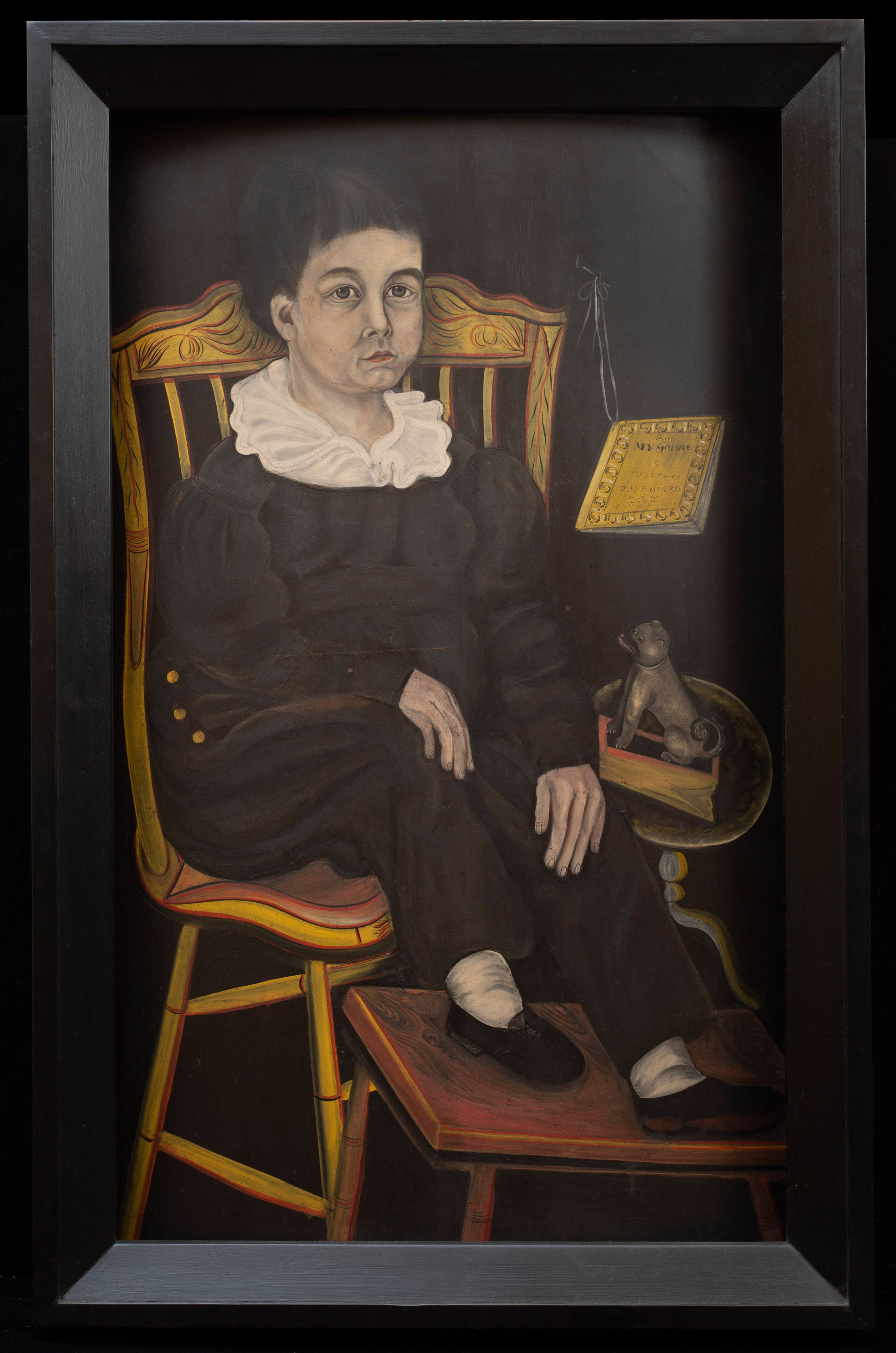 Label TextThis full-length portrait of six-year-old Charles Mortimer French is one of Powers' more intriguing and successful compositions. The artist's keen instinct for composition and color more than compensate for his unfamiliarity with naturalistic anatomy and perspective, and work to create a painting of extraordinary vitality. The back and seat of the bright yellow-painted chair in which French is seated are at impossible angles, as is the small table top on which the squeak toy precariously rests. Of further visual interest is the top of the painted footstool, which has an unnatural curvature seemingly to accommodate the sitter's feet. The result is a vigorous, chaotic group of interactive forms. The loose painting style of Powers' early career is evident throughout the portrait, particularly in the sitter's baggy suit and thickly painted face and hands. The heavy gray shading of the boy's features contributes to his haggard, aged appearance.Charles Mortimer French was born probably in Vermont in 1826 or 1827. He died in Floyd County, Iowa on January or June 11, 1859, at the age of thirty-two years and six months, and was buried at Proctorsville New Cemetery in Cavendish, Vermont.