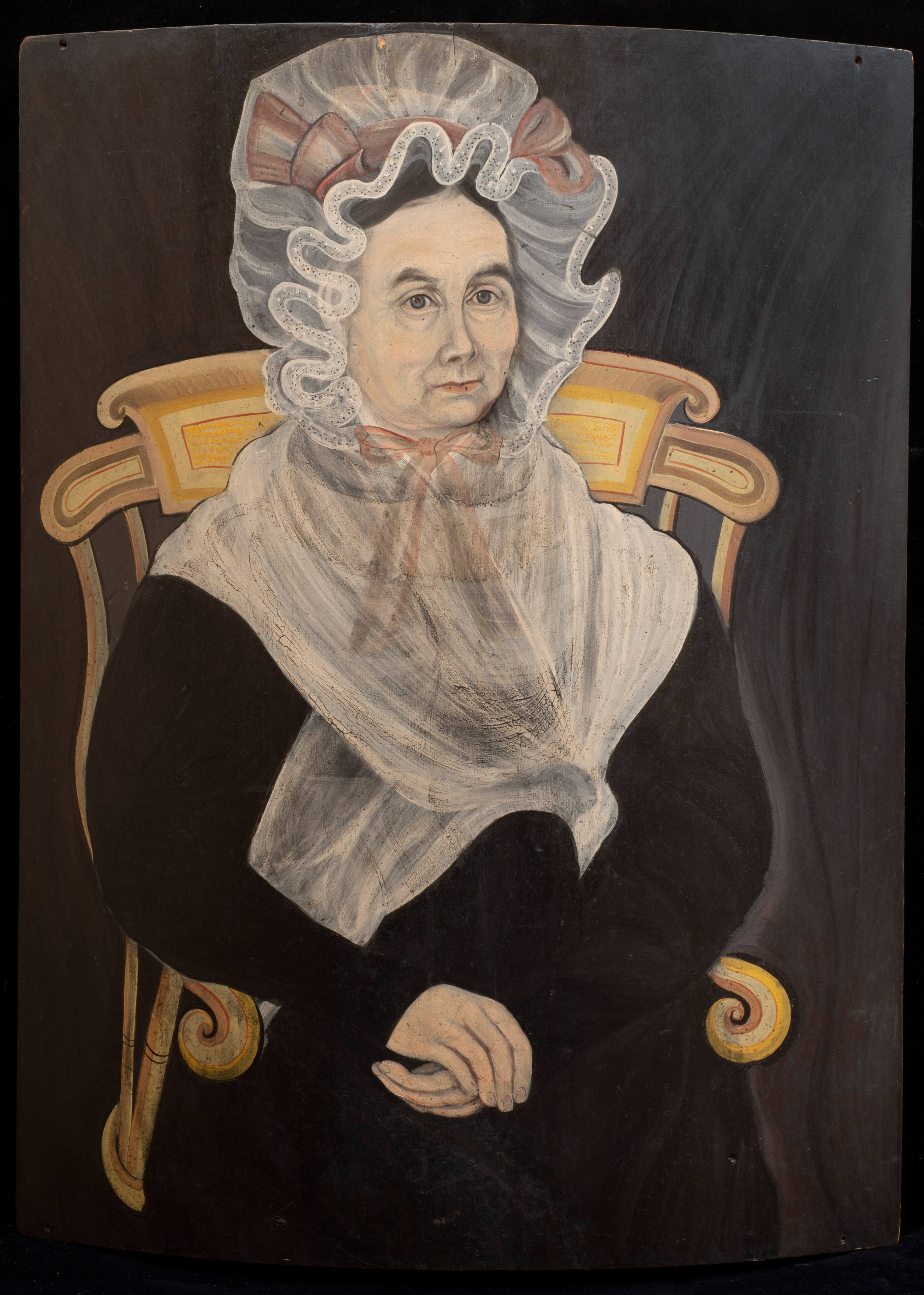 Label TextThis portrait of an unidentified woman is painted with the loose, fluid brush strokes, gray shading, and bold, dark outlines that mark Powers' early style. As in many of his portraits of adult subjects, the artist rendered the seated figure close to the picture plane in a three-quarter length pose. Powers' interest in costume details is evident in the attention paid to the sheer fichu and large white cap. Her hands, folded in her lap, lighten the lower half of the picture and serve to balance the composition.BibliographyPaul S. D'Ambrosio and Charlotte M. Emans, "Folk Art's Many Faces: Portraits in the New York State Historical Association," Cooperstown, NY: NYSHA, 1987: 132-133, illustrated number 78 on page 132.