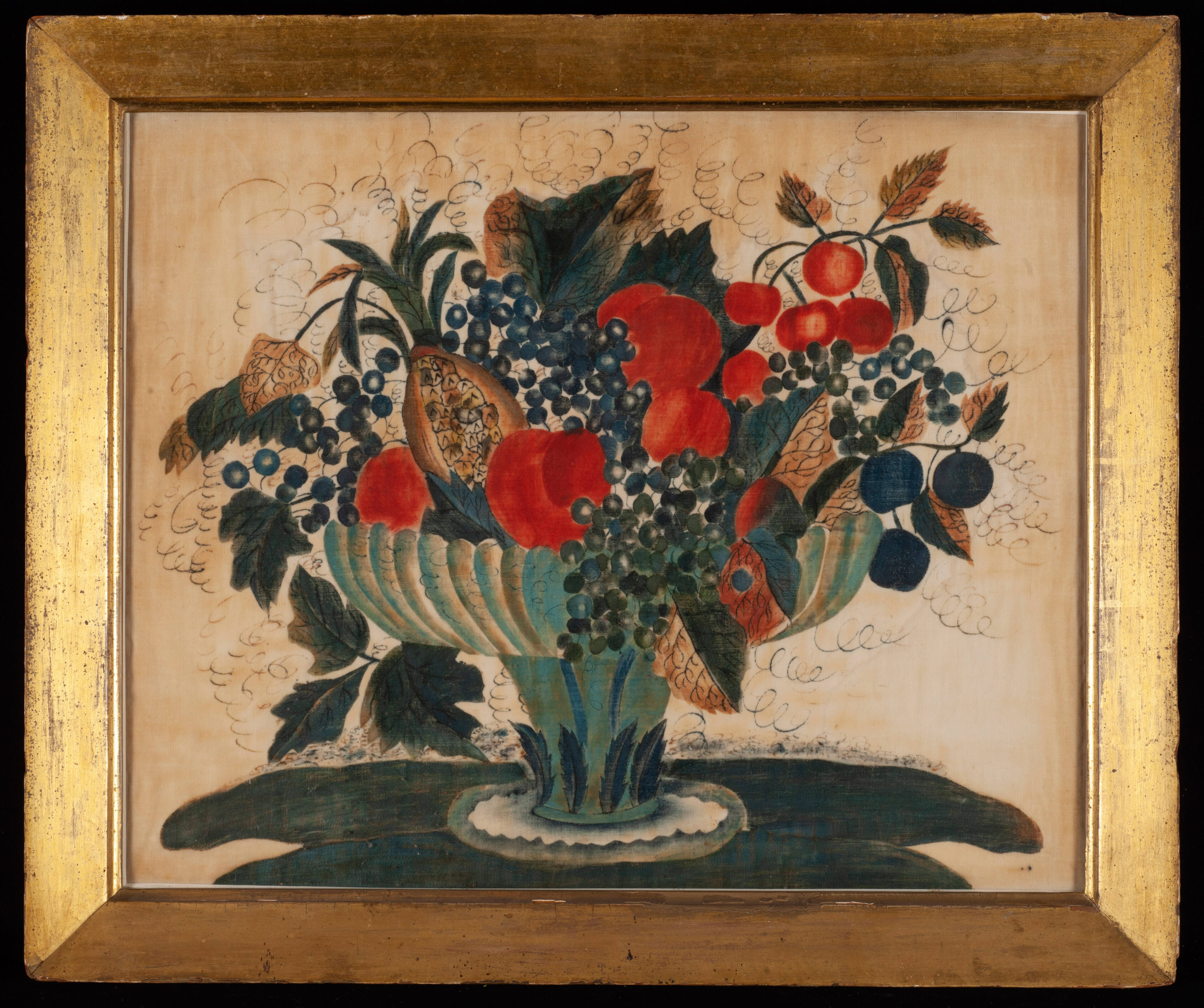 Label TextNo young lady's education, in the early 19th century, was complete without instruction in needlework, drawing and painting. We know from the records of female seminaries and day schools that studies for young women included algebra, astronomy, botany, geology, chemistry, history and philosophy, as well as art, music and calisthenics.The advent of painting using stencils, theorem painting, began early in the 19th century. It rose in popularity to peak about 1840, and surpassed embroidery in desirability as an elegant accomplishment for a young woman.