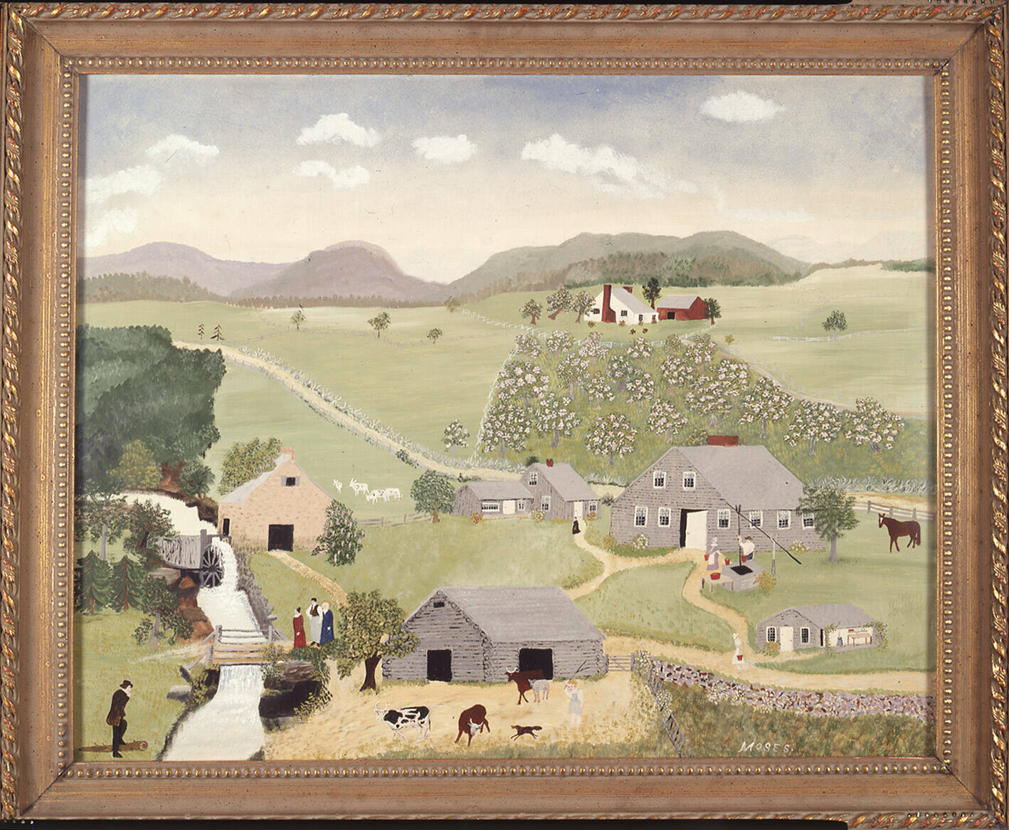 Label TextWhile working on the farm of Mrs. David Burch, Moses was told that the farm’s well inspired the song, “The Old Oaken Bucket.” Paul Dennis, a relative of Mrs. Burch, had fallen in love with a neighbor’s daughter. Her parents objected to the relationship, however, and the relationship languished. Dennis went to sea for several years. According to Mrs. Burch, while away, he wrote the poem and upon returning home gave the poem to a printer. Samuel Woodworth published the poem as his own in 1817 and Dennis was never credited.In 1941 the first version of this painting won a New York State prize at the Syracuse Museum of Fine Arts (now the Everson Museum of Art). In her desire to satisfy her patrons, Moses repeated the subject many times, but no two paintings were alike.