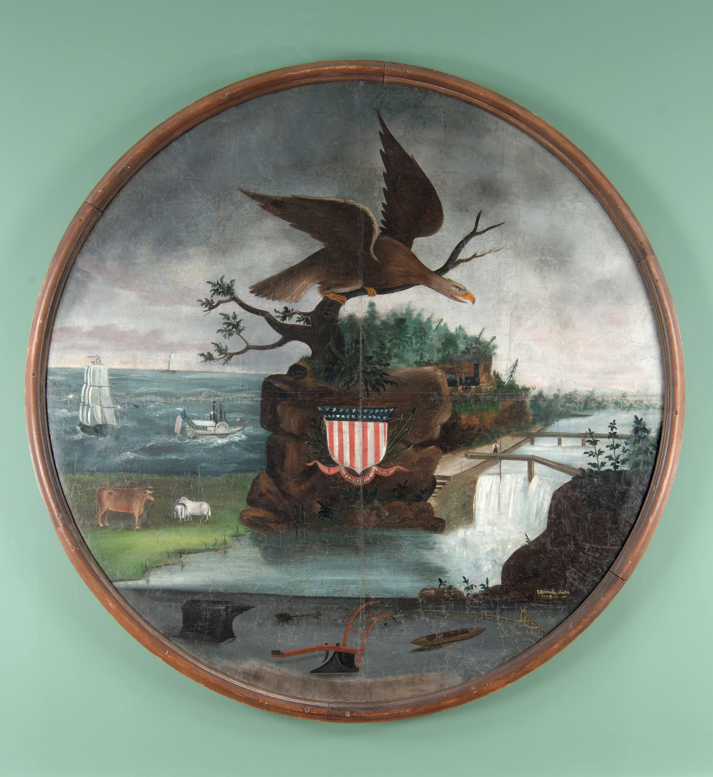 Label TextThis large Whig campaign banner was probably carried in parades or at political gatherings during the 1840s. It carries a potent political message by juxtaposing a screaming eagle-symbol of an aggressive, vital America-and the tricolor shield of the Great Seal of the United States with images of commerce and industry. In this painting, the Erie Canal is of great importance: not only does it dominate the right side of the banner, but this picture was likely based on a scene painted to celebrate the opening of the Canal in 1825. The banner expresses the Whig belief that the development of coastal and internal transportation and the protection of home industries are vital interests to the growing Republic. Kennedy apprenticed as an ornamental coach painter and received training from a local artist in Troy, New York and was an active participant in the Civil War.Exhibition History“Rediscovered Painters of Upstate New York,” New York Historical Society, NY, February 1, 1959 – February 28, 1959; Syracuse Museum of Fine Arts, Syracuse, NY, January 4, 1959 – January 25, 1959; Munson-Williams-Proctor Arts Institute, Utica, NY, November 30, 1958 – December 21, 1958; Albany Institute of History and Art, Albany, NY, October 30, 1958 – November 20, 1958; Rochester Memorial Art Gallery, Rochester, NY, September 26, 1958 – October 21, 1958; New York State Historical Association, Cooperstown, NY, June 14, 1958 – September 15, 1958.