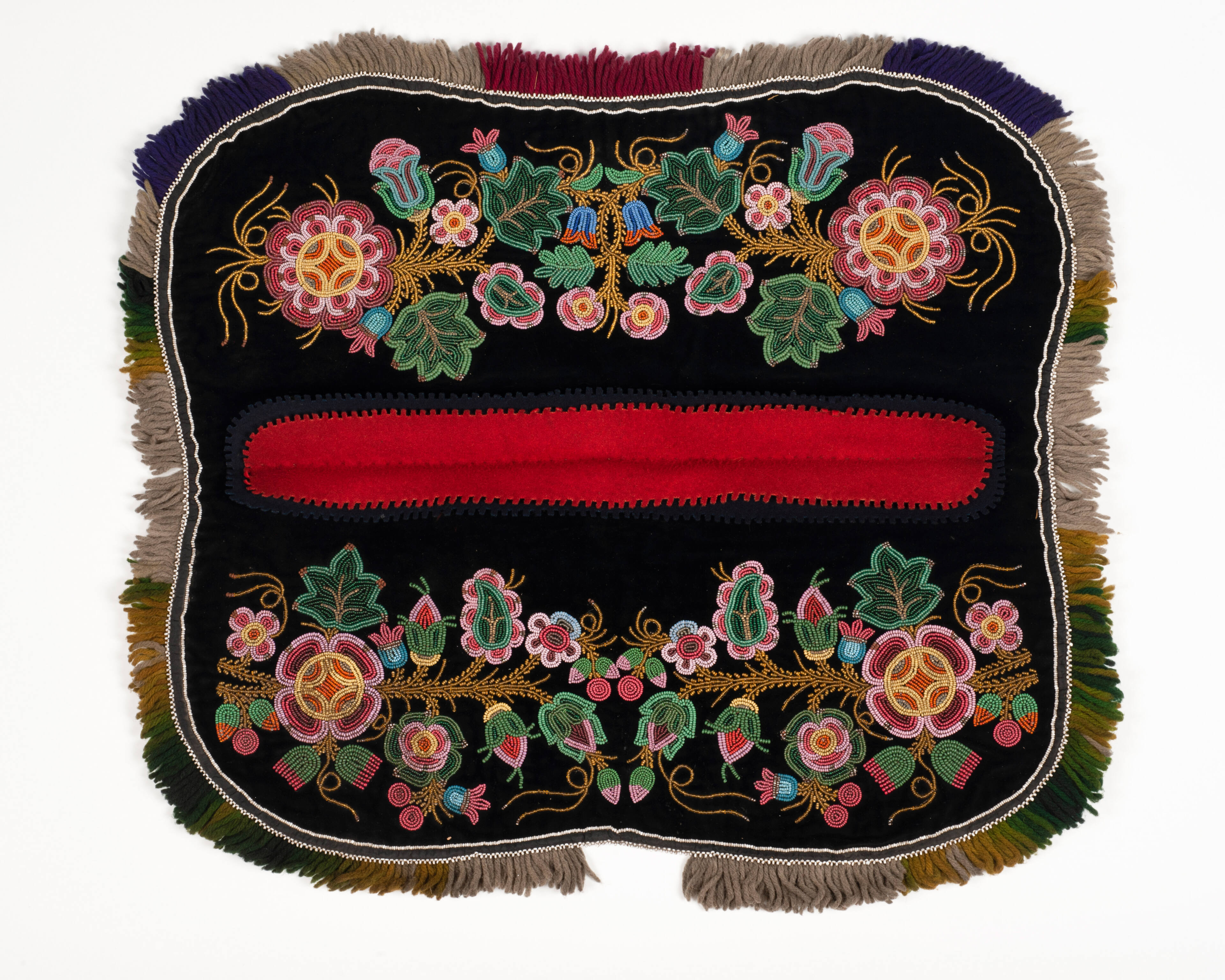 Label TextThese dog blankets, usually called tuppies or tapies, are made in matching sets of even numbers for sled dogs. Dogs only wore the highly decorated blankets when entering a town as they would overheat if they wore them while running. A few miles outside of town, men would stop their dog team to dress them in their blankets. Usually, there was a set of jingle bells sewn into the red wool that would be audible to the village's inhabitants from a distance. Dressing dogs in colorful blankets was a showing of pride for those arriving via sled and the jingle bells added an element of excitement to the visitor's arrival.ProvenanceCollection of Roy H. Robinson, New Mexico