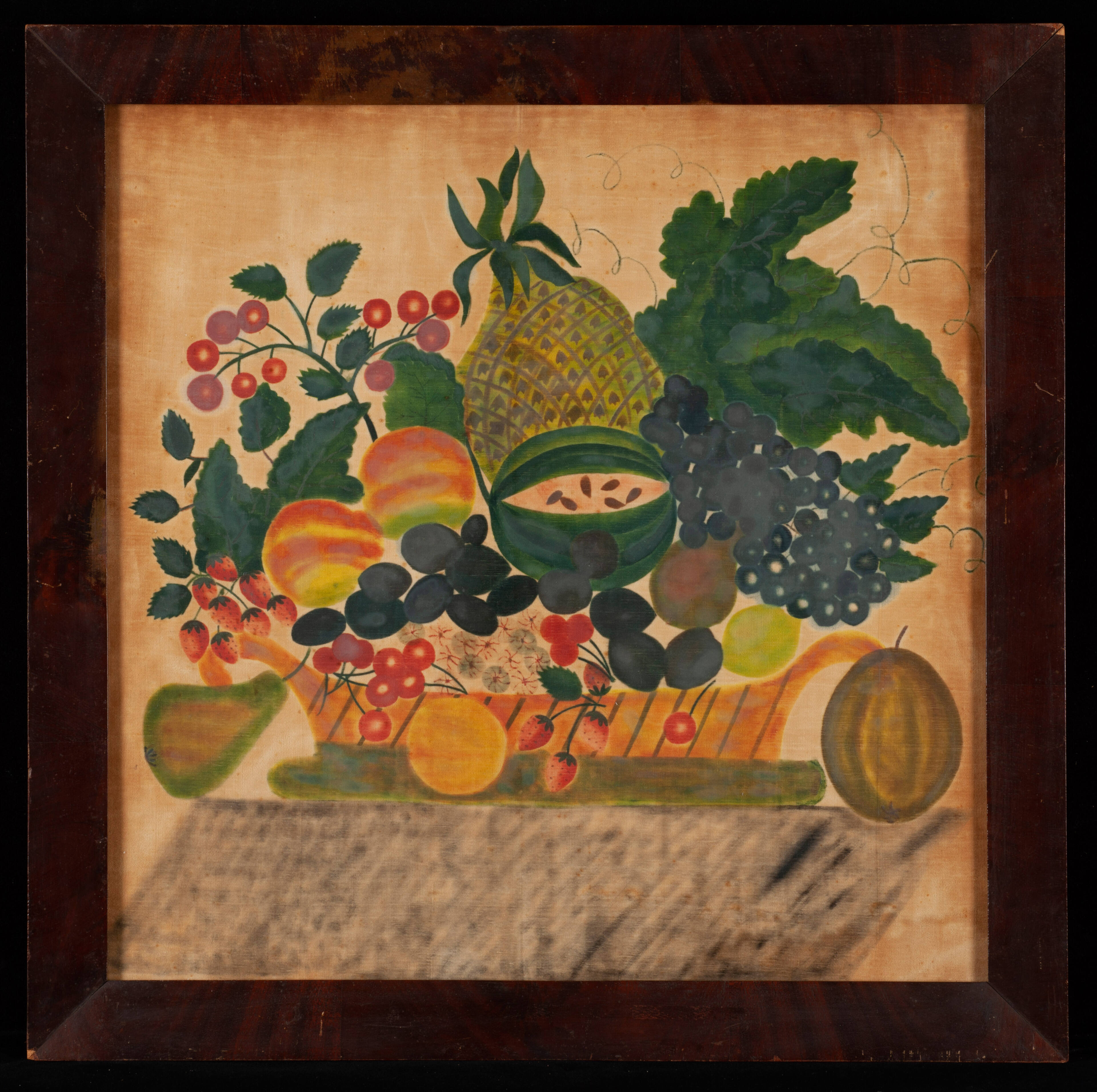 Label TextTheorem paintings are watercolors or oils on velvet or paper. Whether painted freehand or more characteristically by using stencils, this type of painting was constructed in parts, according to a kind of formulas. It consisted of tracing a design on transparent paper, cutting out the pattern and using the resulting stencil. Despite the use of stencils, it required considerable deftness and imagination to combine shapes and shaded colors into pleasing designs. The still life composition was a popular motif, often depicting fruit or flower baskets, or birds.On View