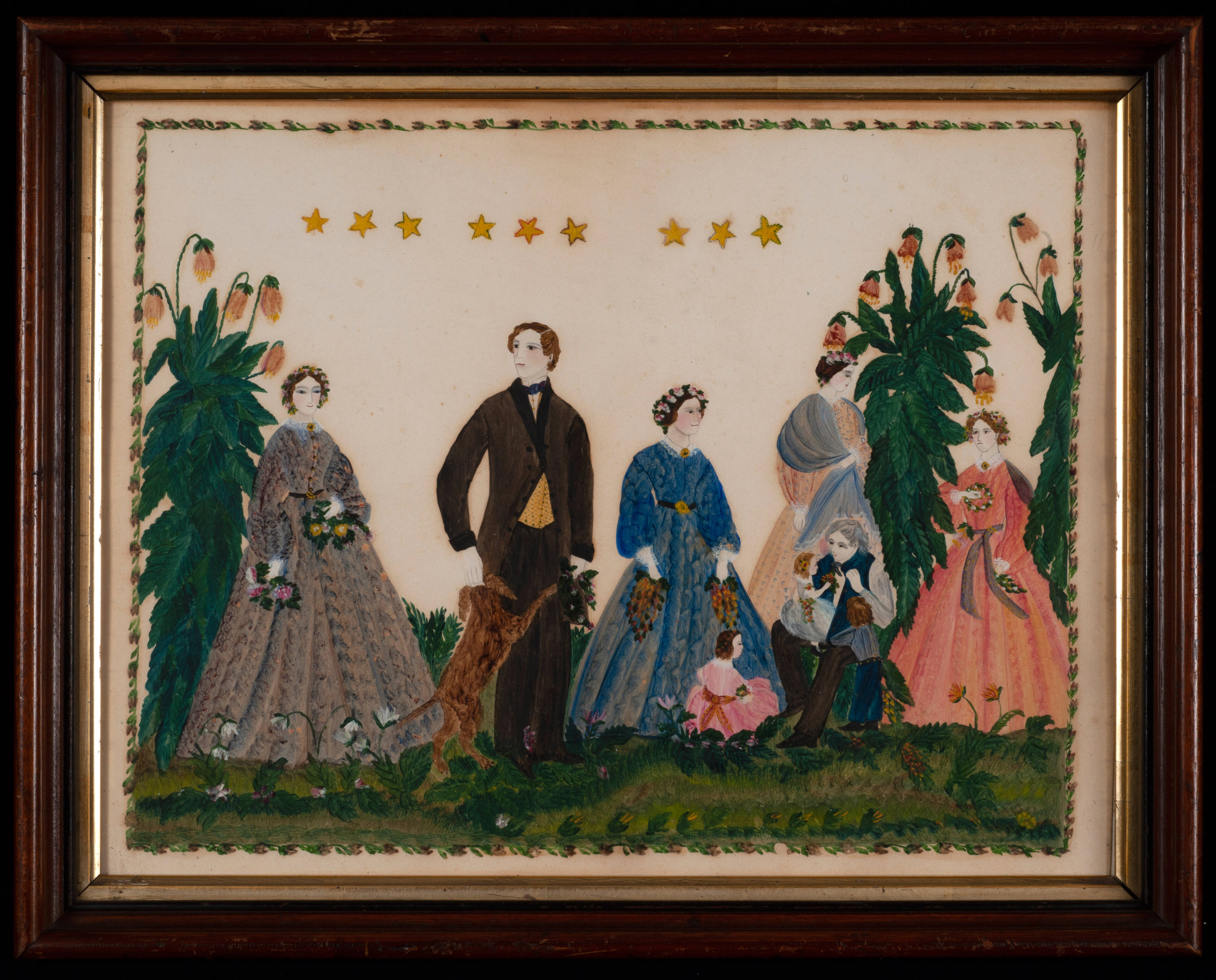 Label TextLittle is known about this picture, which appears to have taken inspiration from published images of fashionable ladies and gentlemen that appeared in such magazines as "Goudy’s Ladies Book." It is more likely a decorative picture than a memorial, despite the title.Exhibition History“The Flowering of American Folk Art,” M.H. de Young Memorial Museum, San Francisco, CA, June 24, 1974 – September 15, 1974; Virginia Museum of Fine Arts, Richmond, VA, April 22, 1974 – June 2, 1974; The Whitney Museum of Art, New York, NY, February 1, 1974 – March 24, 1974.