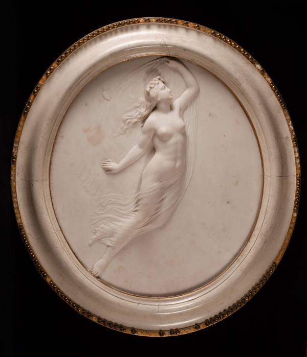 Label Text"Rinehart was a noted American expatriate Neoclassical sculputor. He is considered "the last important American sculptor to work in the classical style." Rinehart spent his formative years in Baltimore, traveled to Italy in 1855, and opeend a permanent studio in Rome by 1858. While there he execusted two bas-reliefs in marble, Night and Morning, from which the works seen here derive. These allegorical images use female figures to represent the two times of day. Eveing is covering the earth with her star covered veil of nighttime, while Morning is removing it.