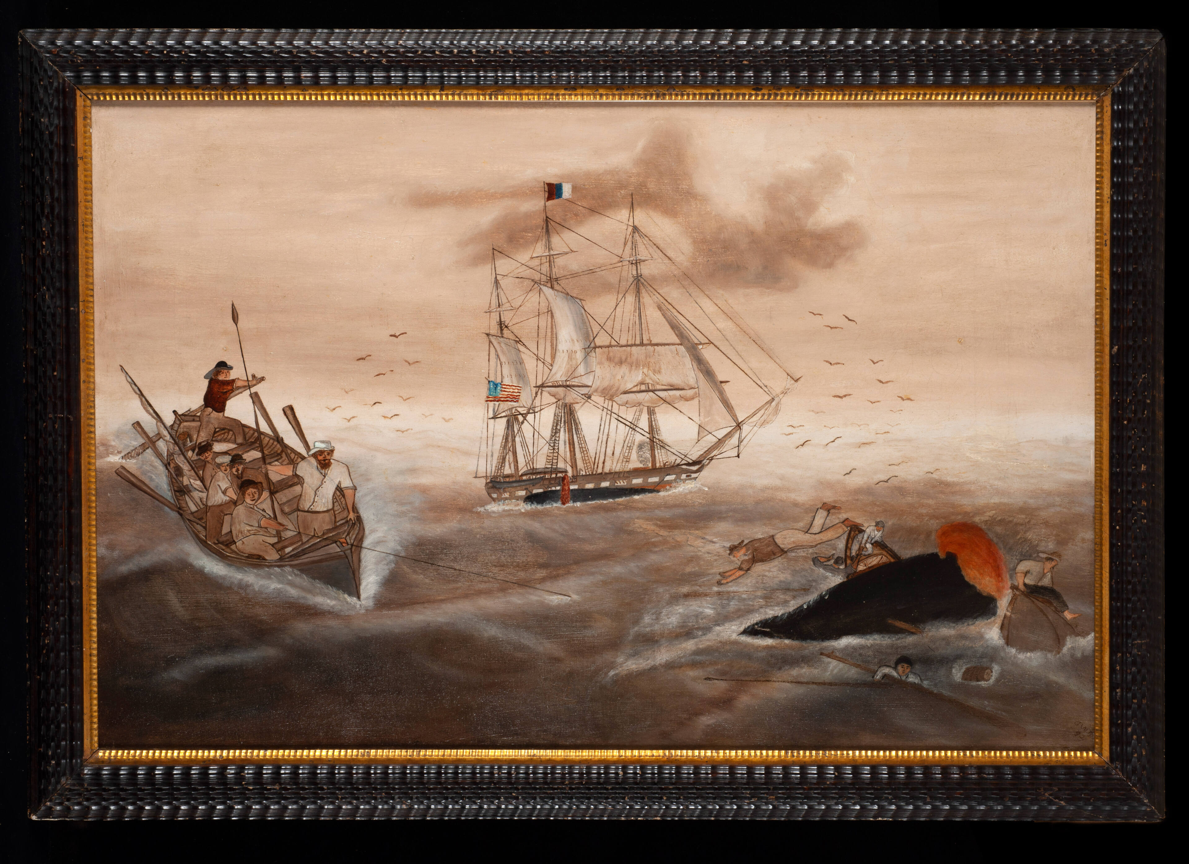 The ship in the center background, and the scene of a whaleboat being broken in half in the lower right, were originally painted around 1830 by the British artist J. Huggins.